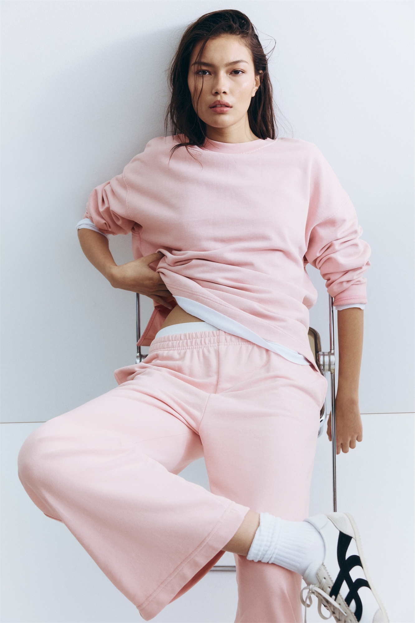 Топ оверсайз из хлопкового толстовочного материала с потертым видом. Круглый вырез с ребристой отделкой, спущенные плечи и длинные рукава. Видимый шов по спинке и прямой подол с разрезом с каждой стороны.