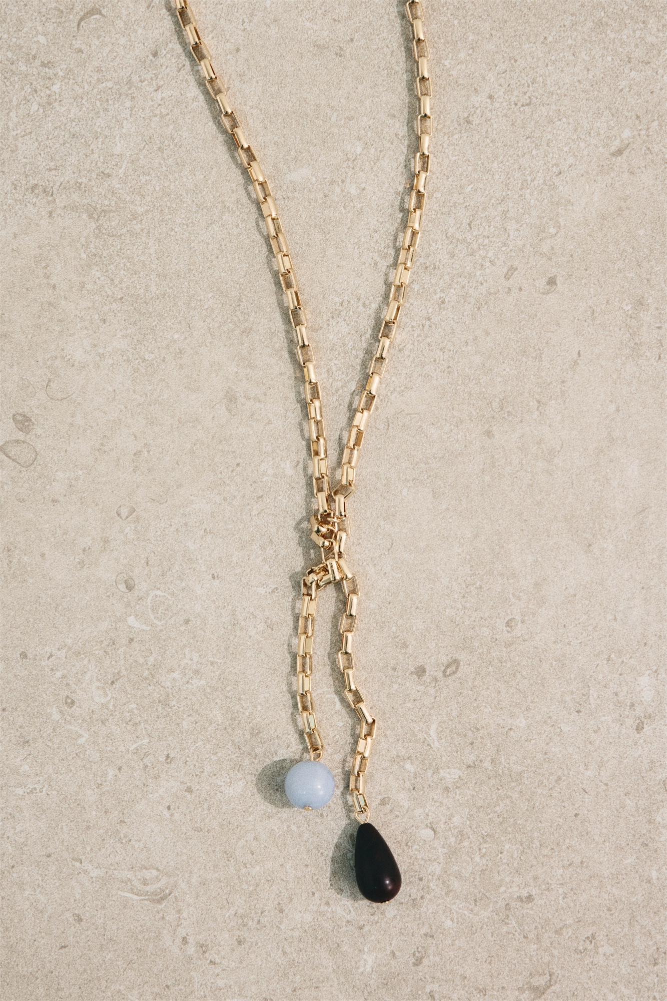 Ожерелье, изготовленное из цепочки типа «бокс», завязанной в узел спереди с концами, заканчивающимися бусинами. Регулируемая длина с застежкой-триггером.