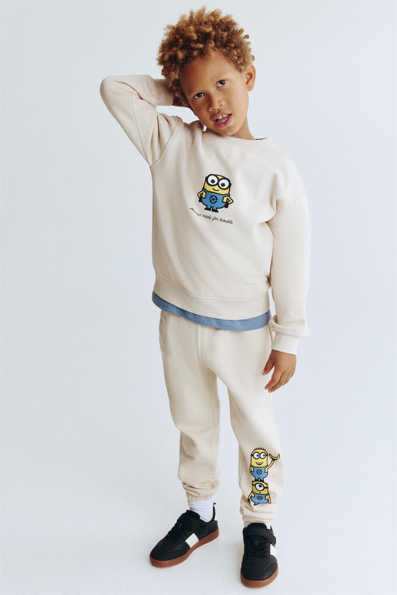 Комплект из топа и джоггеров из толстовки с мягкой ворсистой внутренней стороной и принтом. Топ с длинными рукавами, круглым вырезом с ребристой отделкой, спущенными плечами и окантовкой манжет и подола. Джоггеры с эластичным утягивающим поясом и эластичными вставками на подоле.