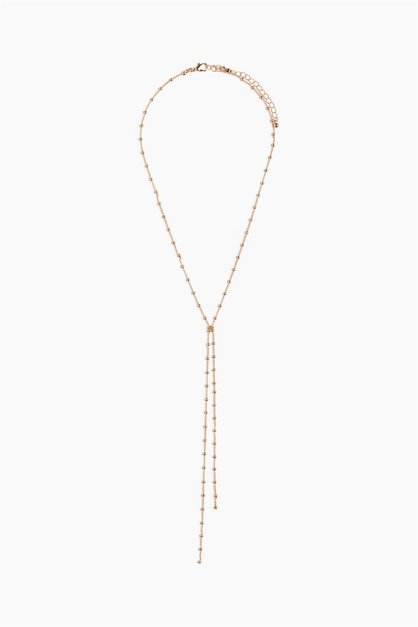 Длинное металлическое колье, состоящее из двух отдельных цепочек с точечным звеньями, соединенных небольшим кольцом спереди. Регулируемая длина с застежкой-триггером.
