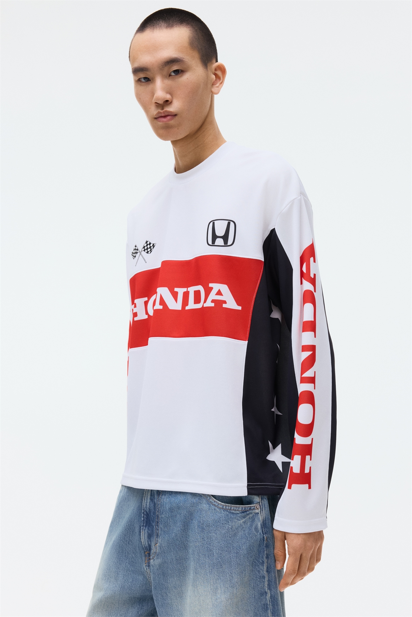 Топ из сетки с принтом, круглым вырезом, заниженными плечами, длинными рукавами и прямым подолом. Оверсайз-крой для мешковатого, очень свободного силуэта.