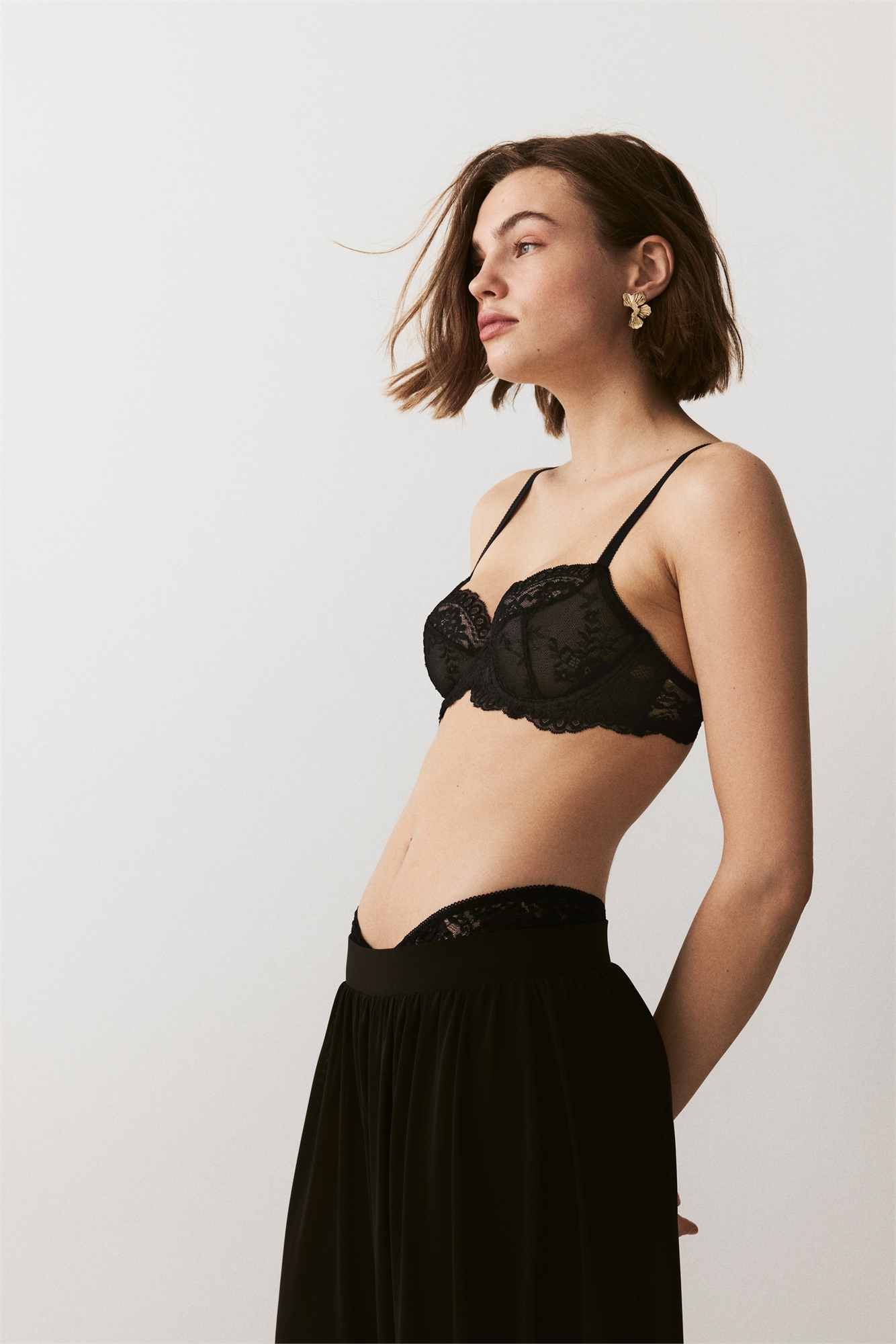 Бюстгальтер из прозрачного кружева с регулируемыми бретелями и чашками на косточках, которые придают груди естественную форму и обеспечивают легкую поддержку. Застежка на крючках сзади.