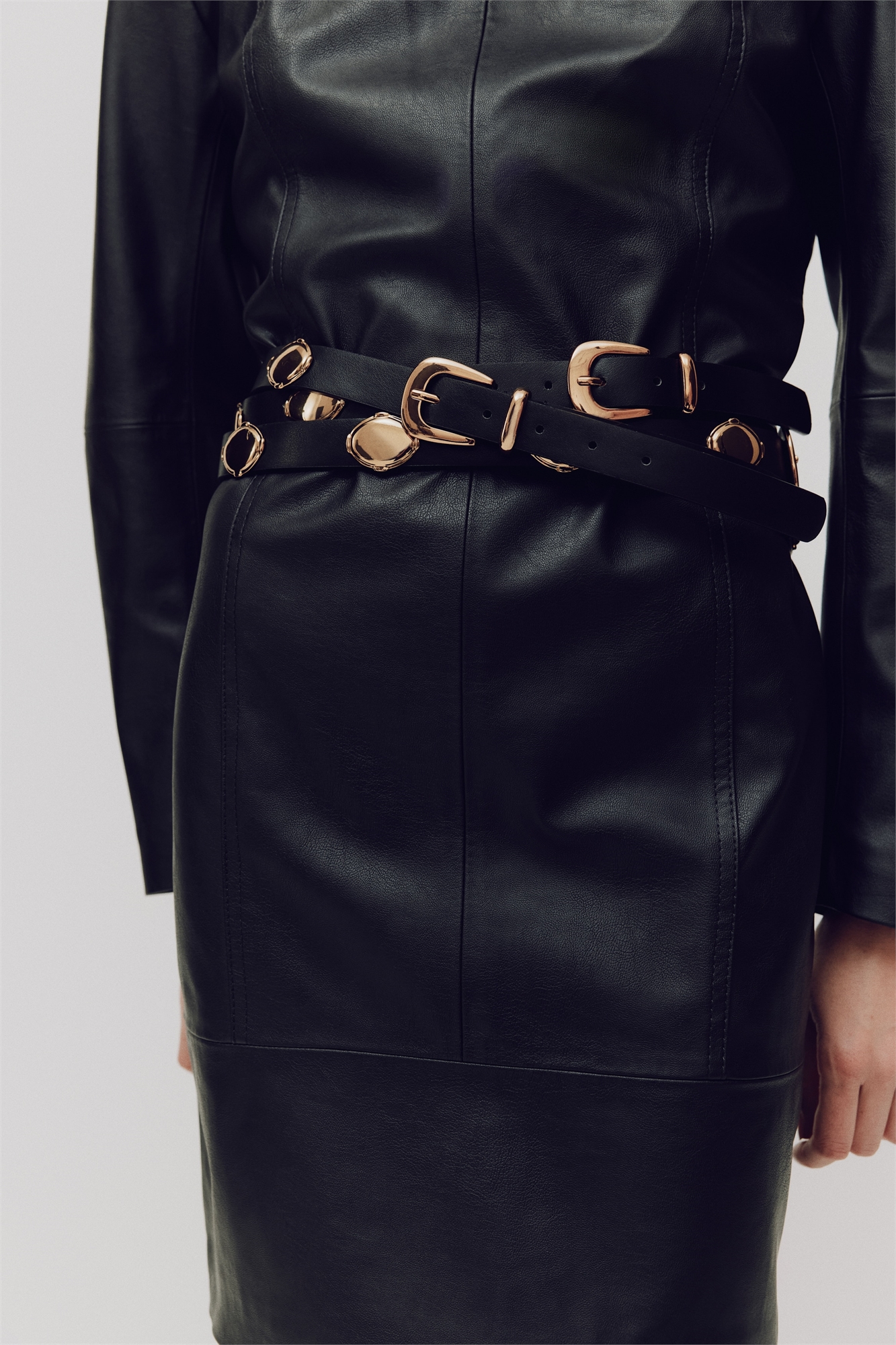 Ремень с металлической пряжкой и овальными металлическими деталями.