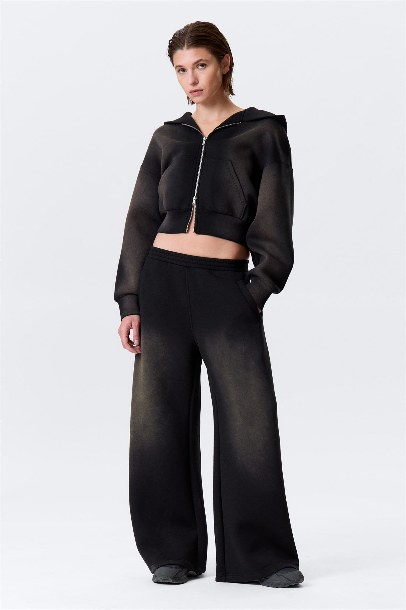 Пара широких тренировочных брюк с моющимся и структурированным силуэтом, выполненных из прочного материала скуба с мягким эффектом. С поясом со средней посадкой и косыми карманами.