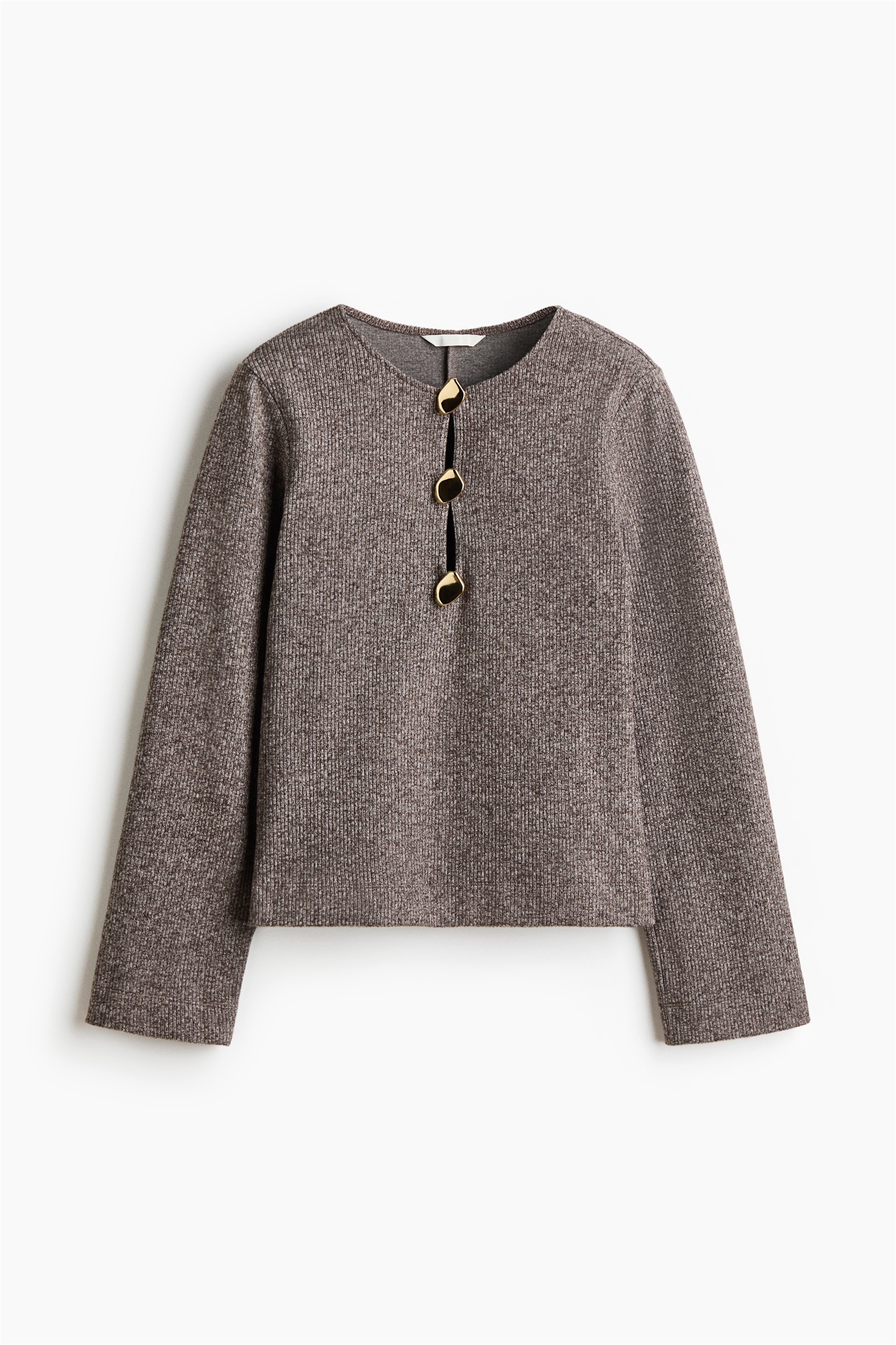 Ребристая рубашка с длинными рукавами из мягкого хлопкового микса. Круглый вырез с двойной замочной скважиной спереди с крупными металлическими пуговицами органической формы.