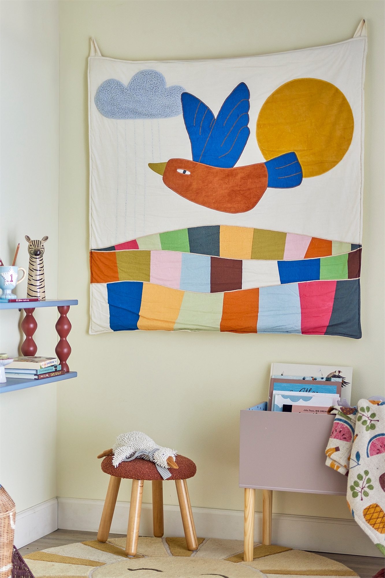 Настенное украшение Colorine от Bloomingville MINI выполнено из хлопка и украшено атмосферным мотивом птицы, летящей над безмятежным пейзажем. Красивая фреска привносит тепло и индивидуальность в детскую комнату.L101xW101 см