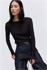 Облегающий топ с длинными рукавами из кружевного трикотажа с вырезом-лодочкой. Манжеты и подол отделаны оверлоком.