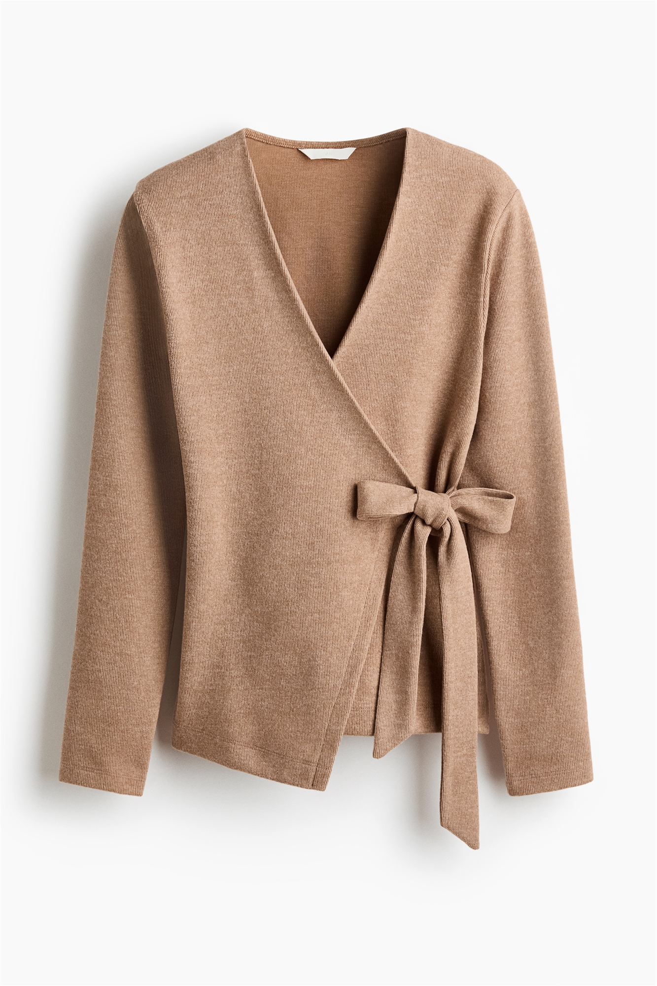 Кардиган облегающего кроя из мягкого трикотажа. С V-образным вырезом горловины, широкими завязками с одной стороны и узкими потайными завязками с другой.