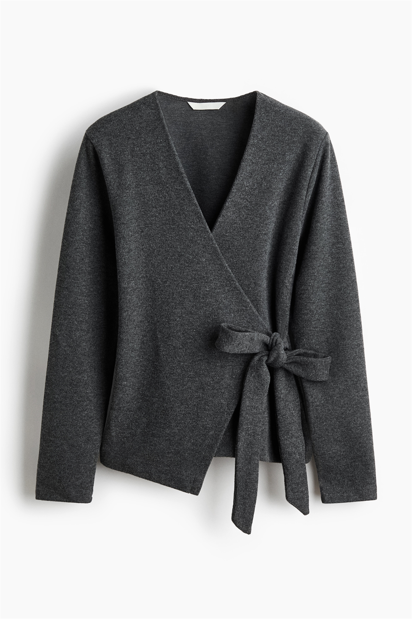 Кардиган облегающего кроя из мягкого трикотажа. С V-образным вырезом горловины, широкими завязками с одной стороны и узкими потайными завязками с другой.