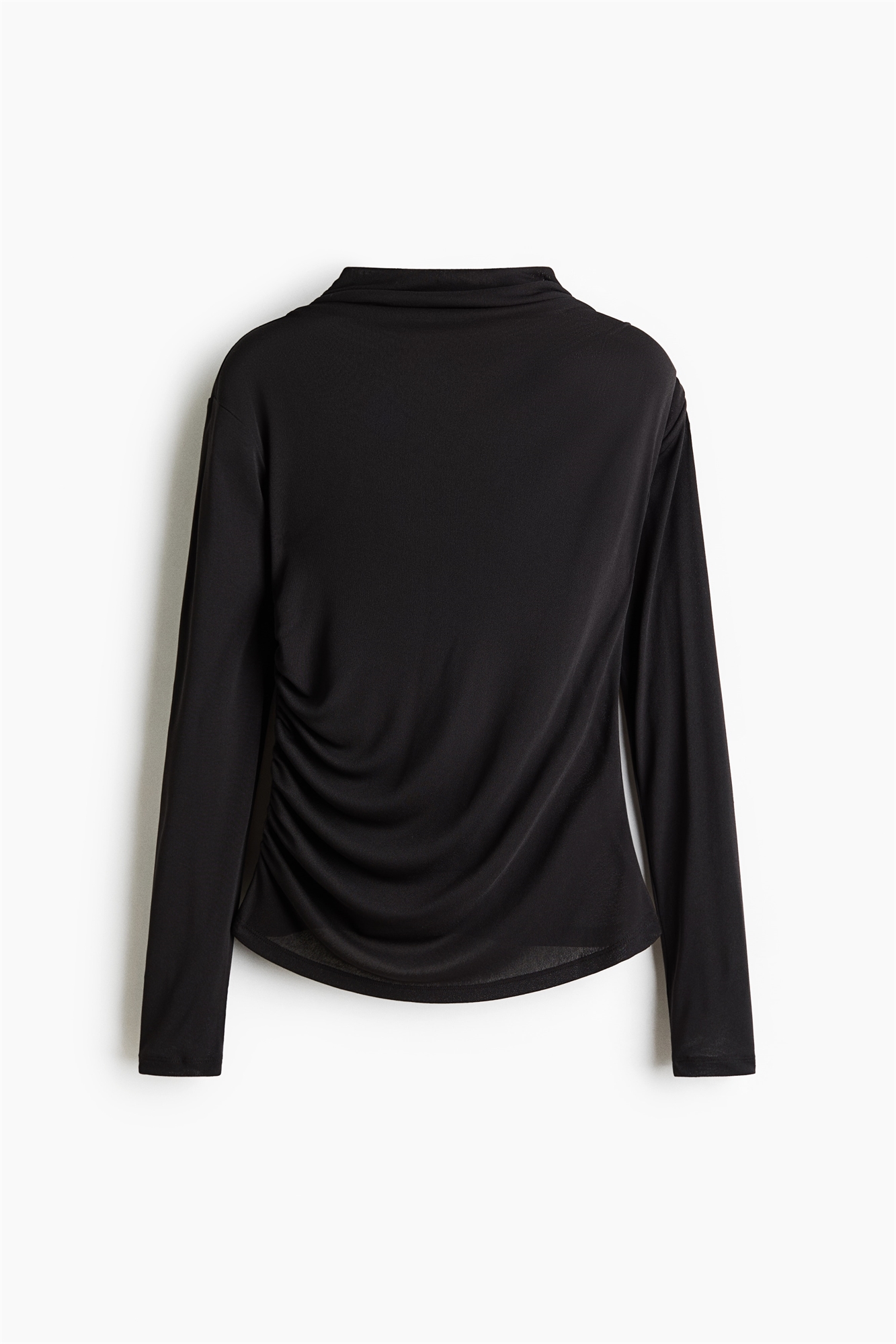 Облегающая фигуру рубашка с длинными рукавами из легкого трикотажа с водолазкой и сборками на одном плече и на противоположной талии для создания эффекта драпировки.