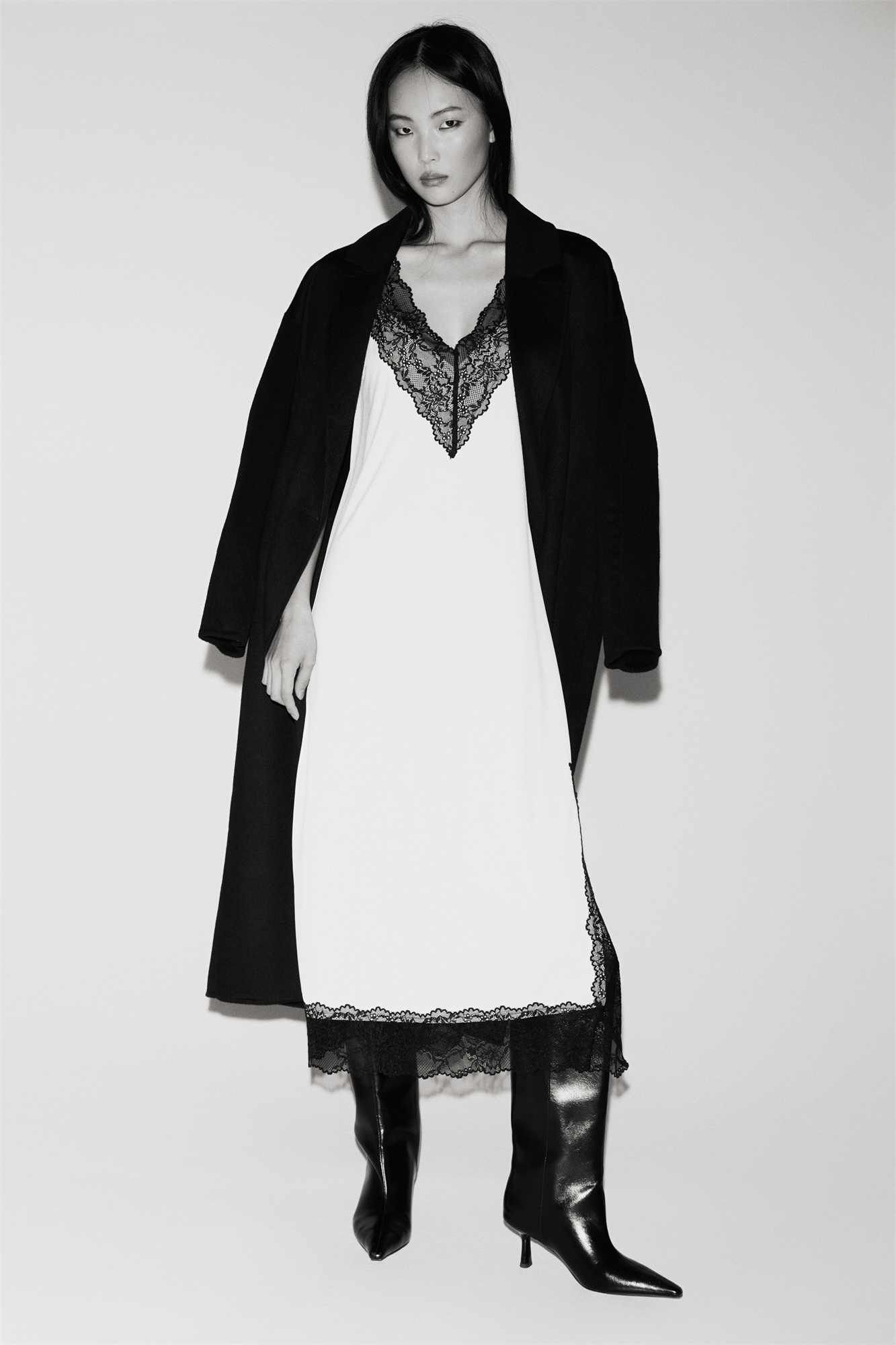 Платье длиной до колена из мягкого трикотажа с глубоким V-образным вырезом спереди и сзади, украшенным кружевной отделкой, которая продолжается на широких бретелях. Подол с кружевной отделкой и разрезом с одной стороны.