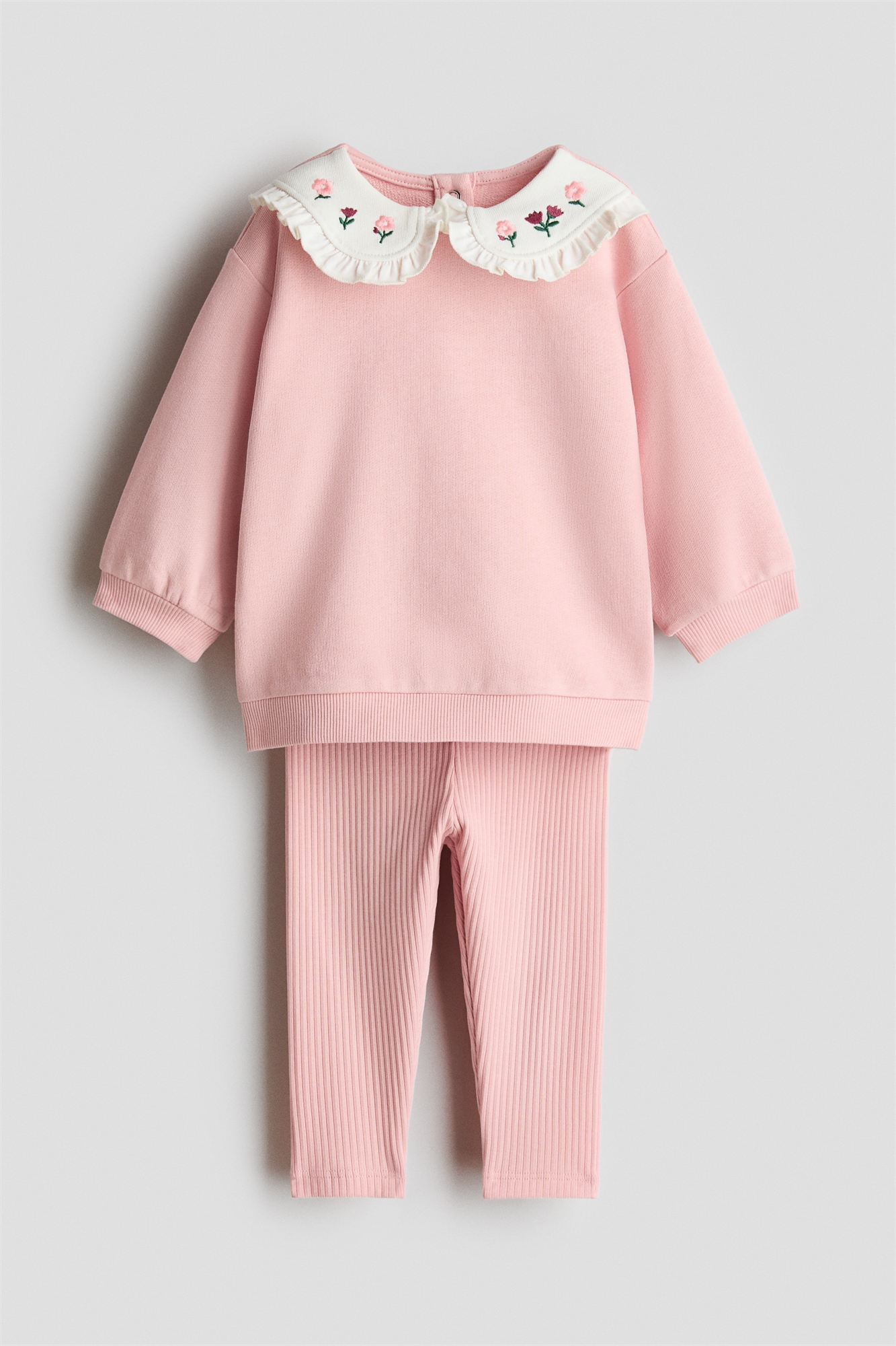 Комплект из топа из мягкой ткани для свитшотов и леггинсов из ребристого джерси, оба изделия изготовлены из хлопка. Топ с круглым вырезом и воротником с оборкой попереду, украшенным мелкими принтами. Застежка на кнопках сзади, заниженные плечи и ребристые манжеты и подол. Леггинсы с регулируемой эластичной талией.