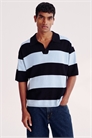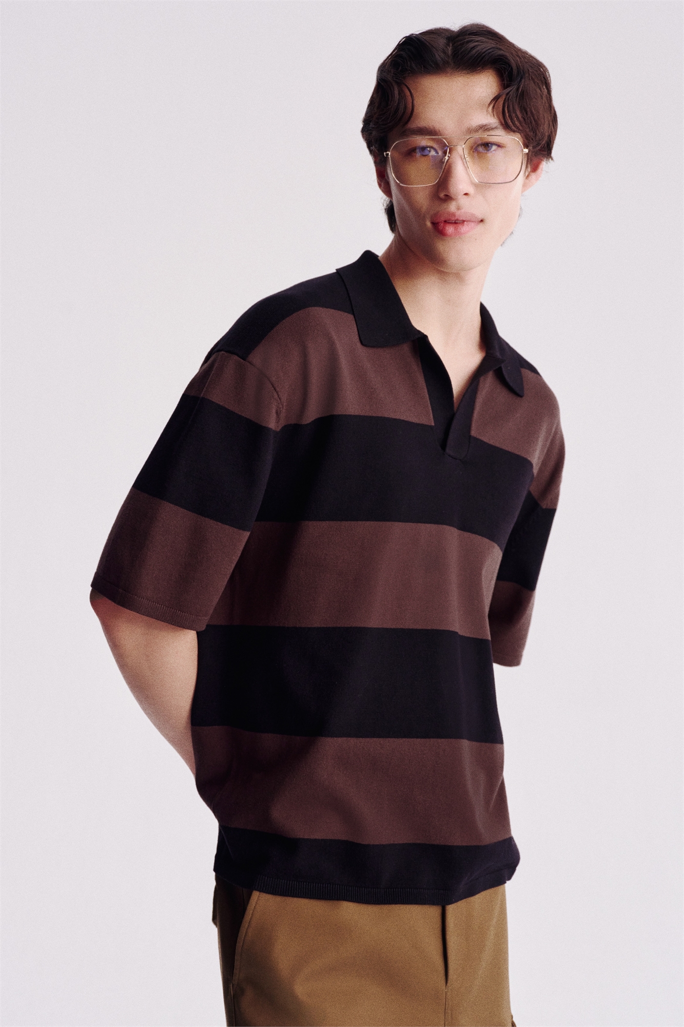 Рубашка-поло с короткими рукавами из трикотажной вискозной смеси с ребристым воротником, V-образным вырезом спереди и прямым подолом. Свободный крой для просторного, но не слишком объемного силуэта.