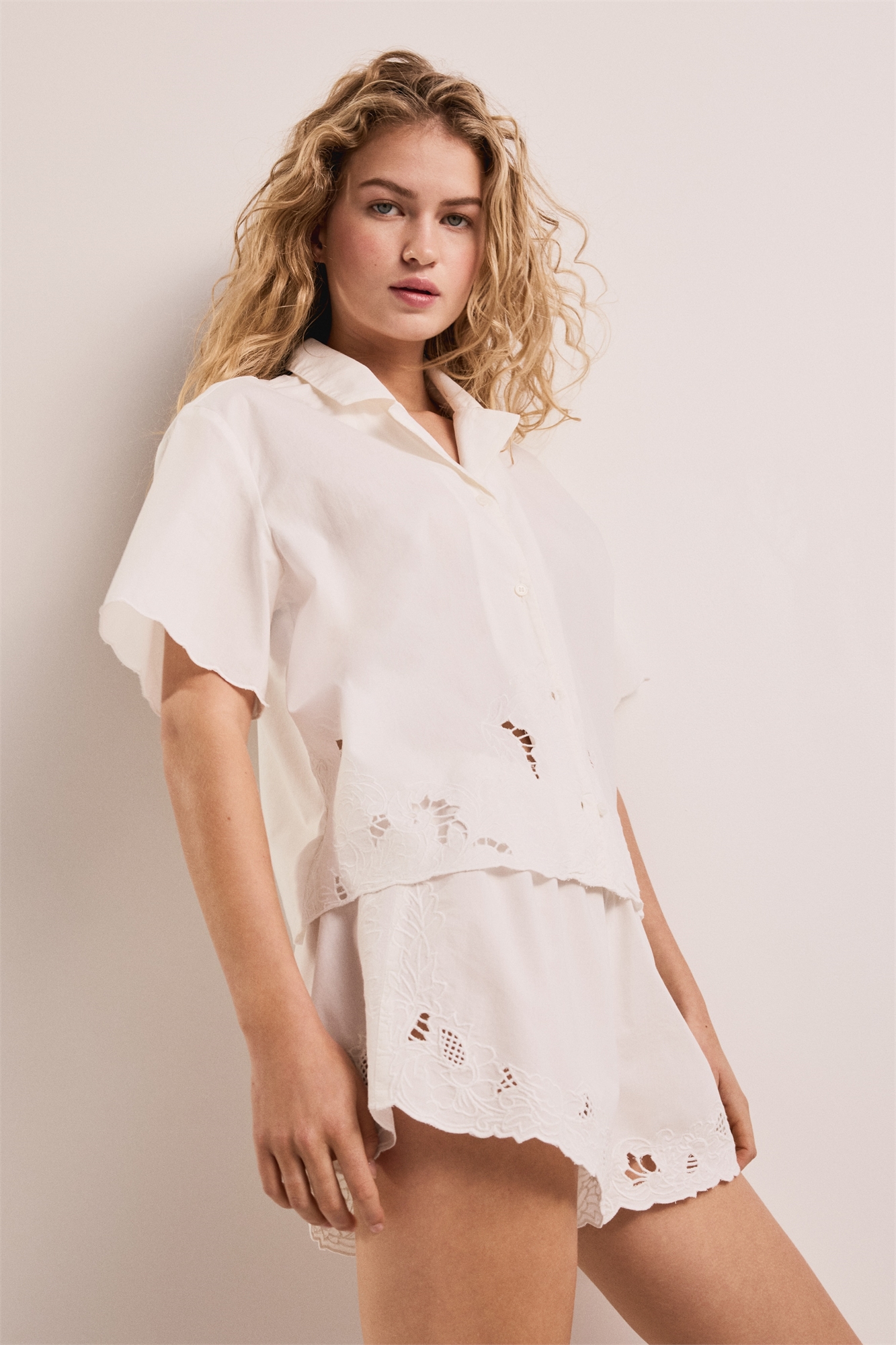 Пижама с рубашкой и шортами из хлопчатобумажной ткани с английским кружевом и зубчатыми краями. Рубашка с воротником-стойкой, пуговицами спереди и короткими рукавами. Шорты с закрытой резинкой и оборкой на талии.