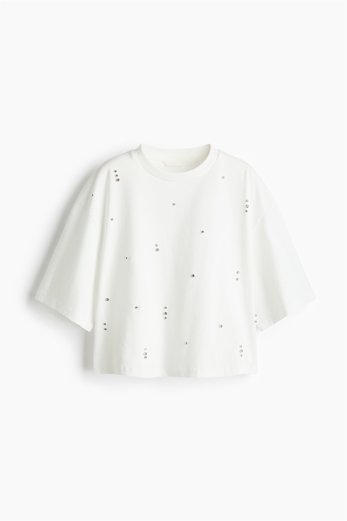 Футболка большого размера из хлопкового джерси с декоративными стразами. Ребристый круглый вырез, спущенные плечи и рукава длиной до локтя.