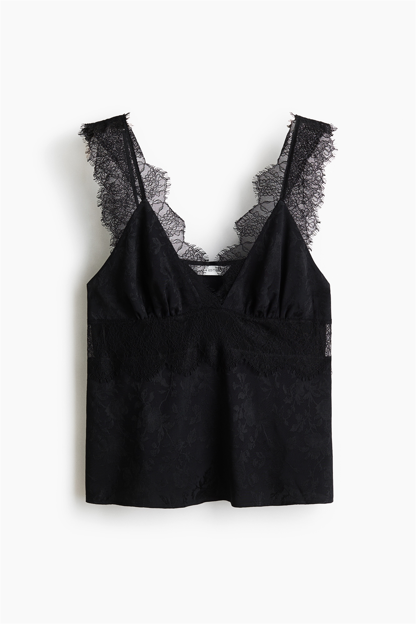 Топ из жаккардового переплетения с легким блеском. V-образный вырез с кружевной отделкой, переходящей на бретели, и собранные чашечки с кружевной панелью внизу.
