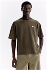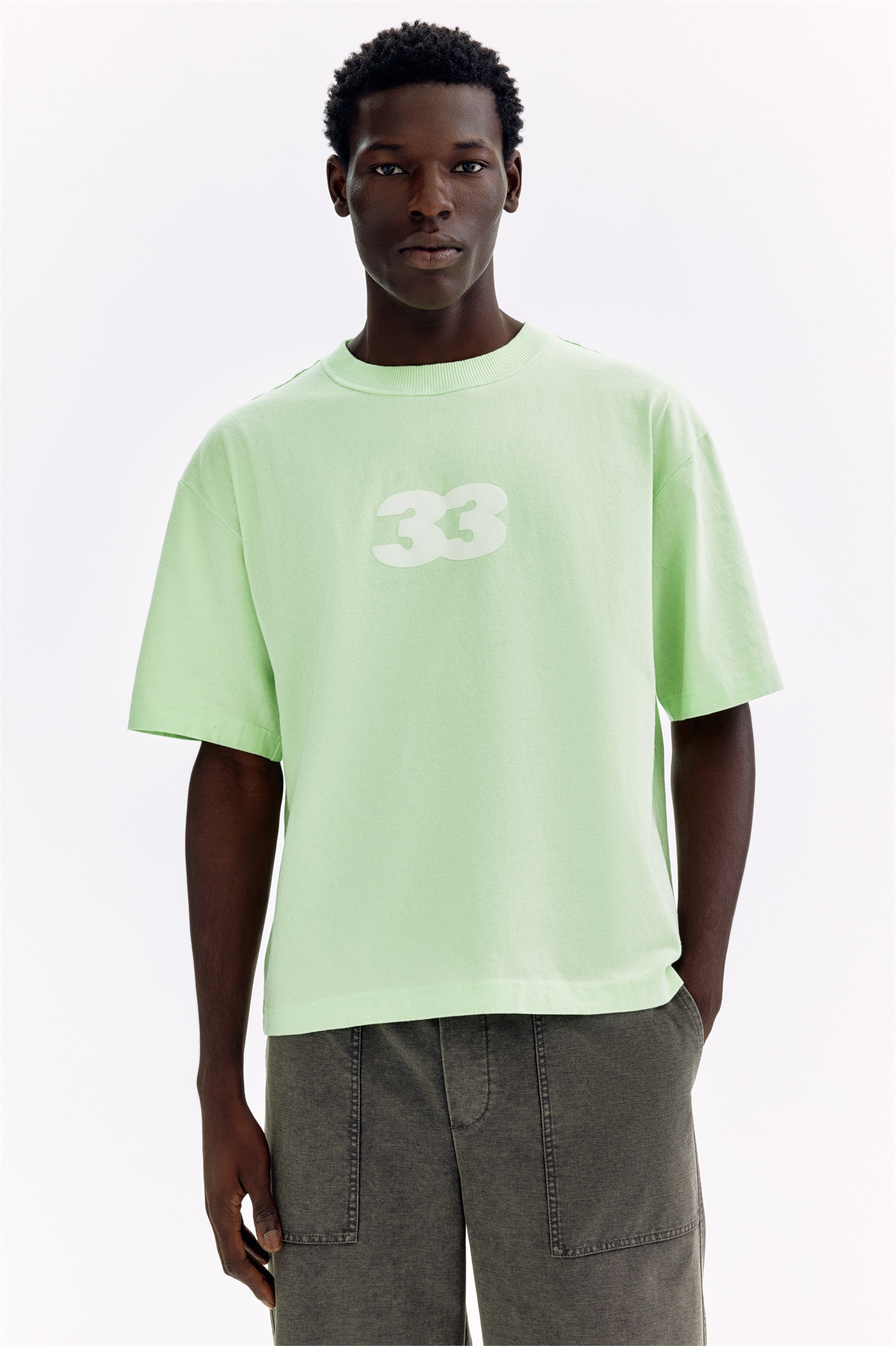 Футболка из плотного хлопкового джерси с круглым вырезом с ребристой отделкой, заниженными плечами и прямым подолом. Свободный крой для просторного, но не слишком объемного силуэта.