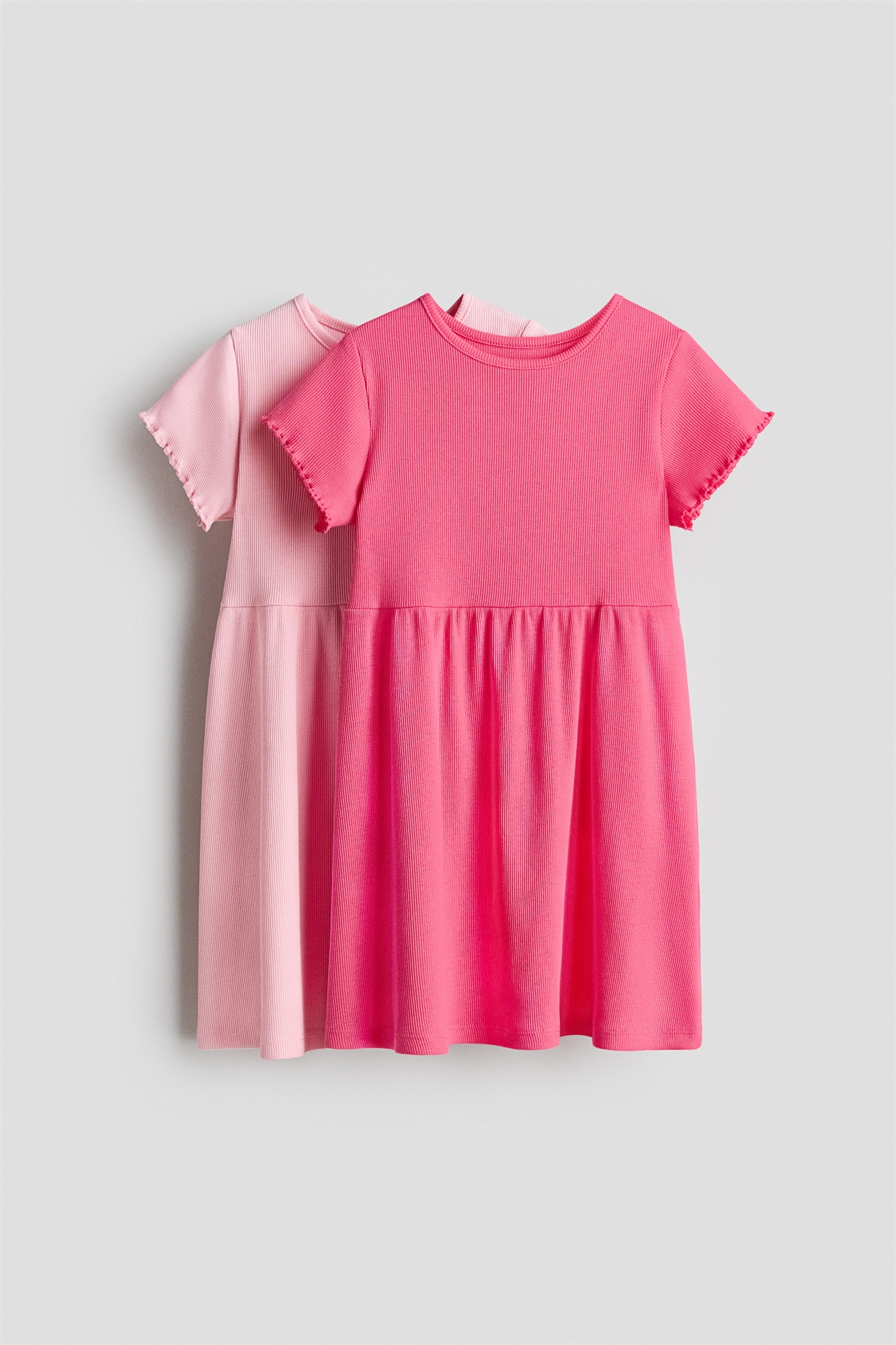 Платья из мягкого хлопкового джерси с ребристой текстурой, с круглым вырезом, короткими рукавами с оверлочными краями на манжетах и сборкой на талии.