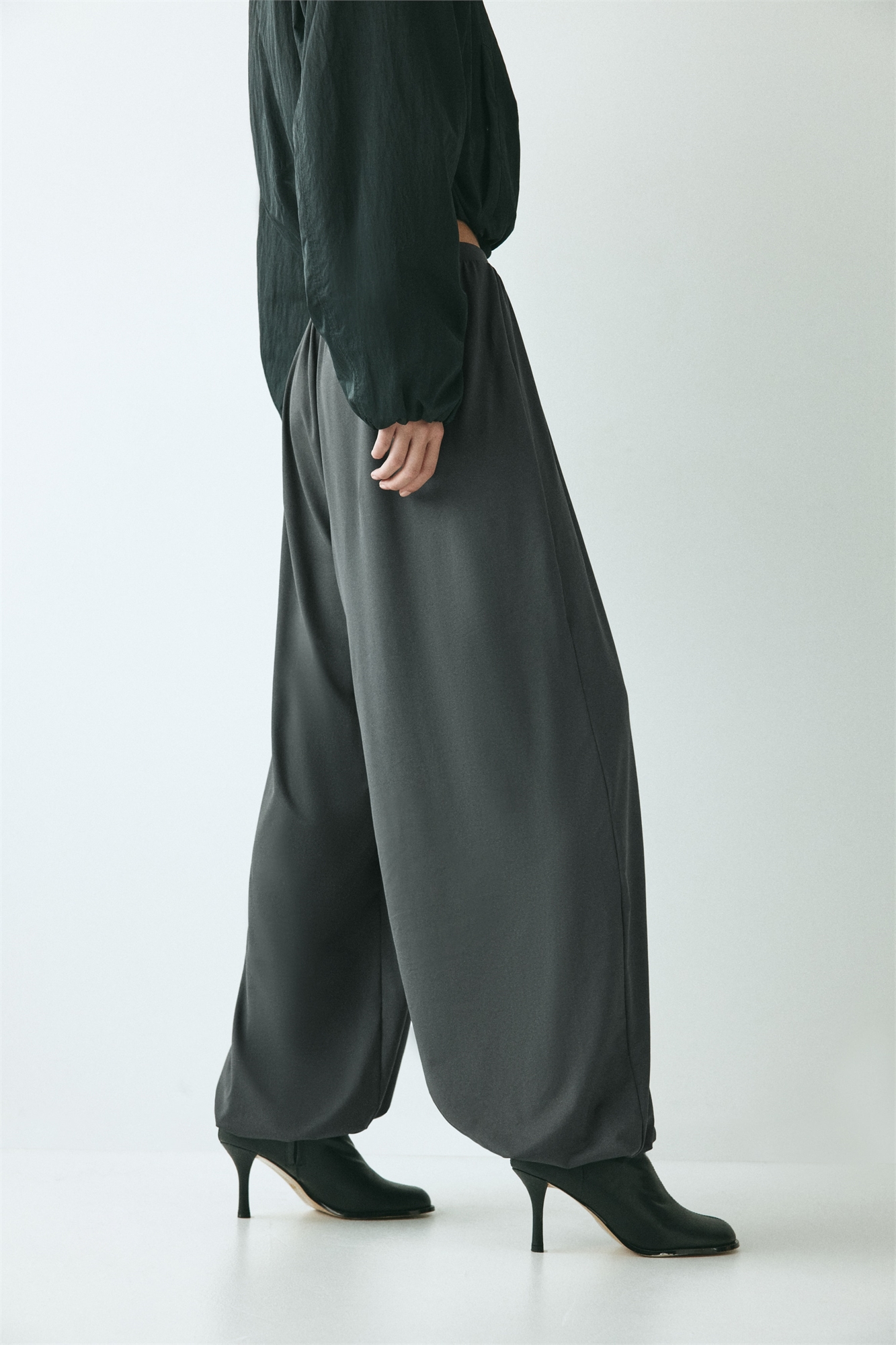 Брюки свободного кроя из мягкого джерси с эластичным поясом со сборками и широкими брючинами с эластичными манжетами.