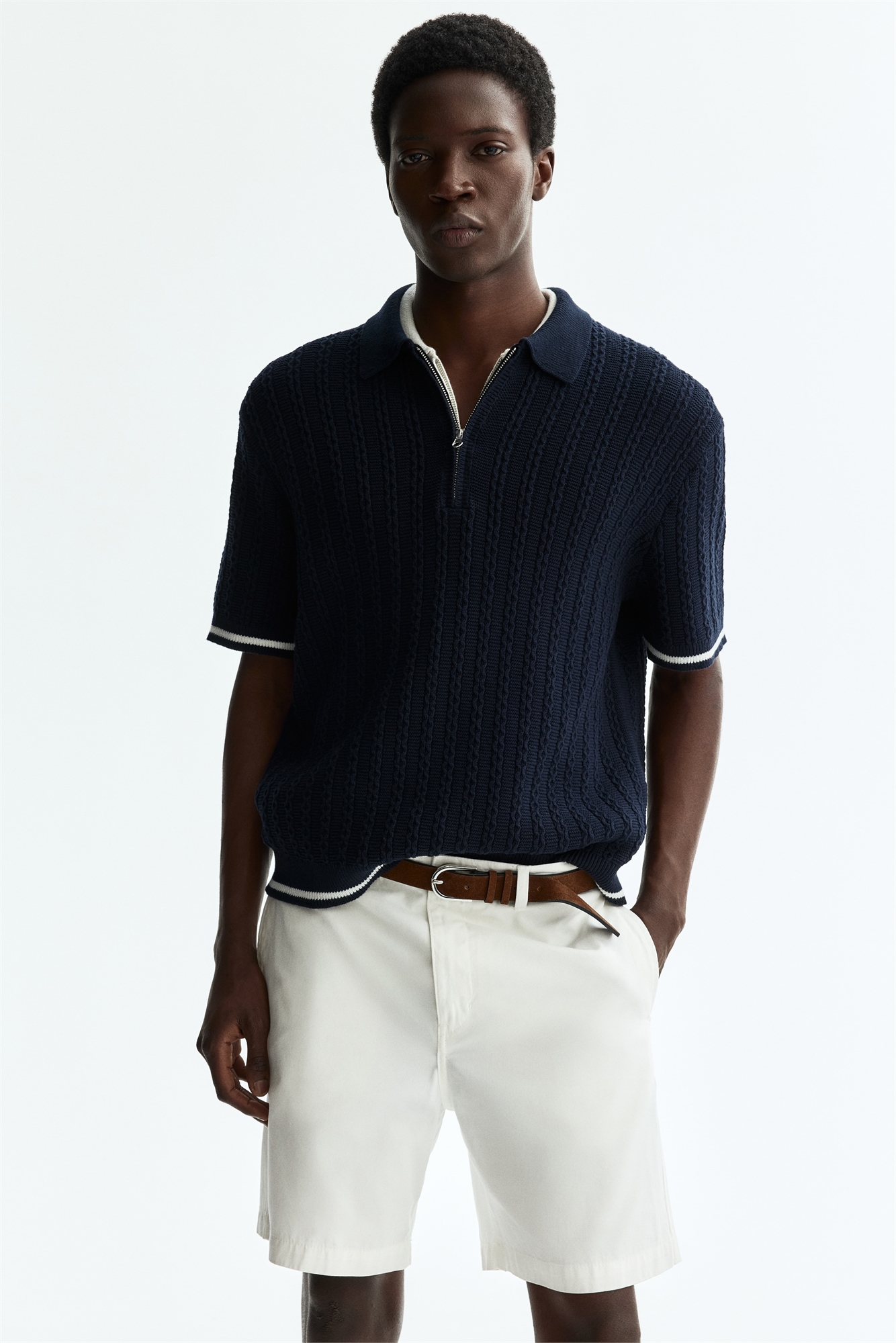 Поло из хлопчатобумажной ткани с фактурным узором, с воротником, застежкой-молнией сверху, короткими рукавами и прямым низом. Свободный крой, создающий непринужденный, но не слишком объемный силуэт.
