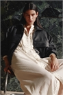 Длинное платье из гофрированного хлопчатобумажного полотна с кружевной кокеткой спереди. Воротник-стойка, потайные пуговицы спереди с кружевной отделкой и узкий пояс-завязка на талии. Длинные рукава-баллоны с манжетами на пуговицах и прямым подолом. Короткое платье с V-образным вырезом и регулируемыми бретелями.