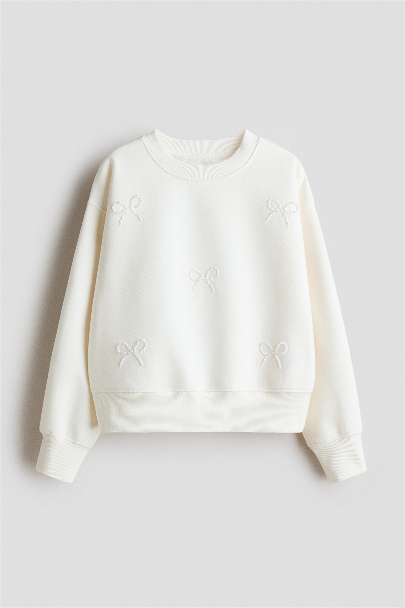Топ из хлопкового бленда с мягким начесом внутри и деталями из мотивов. Ребристый вырез, спущенные плечи, манжеты и подол в рубчик.