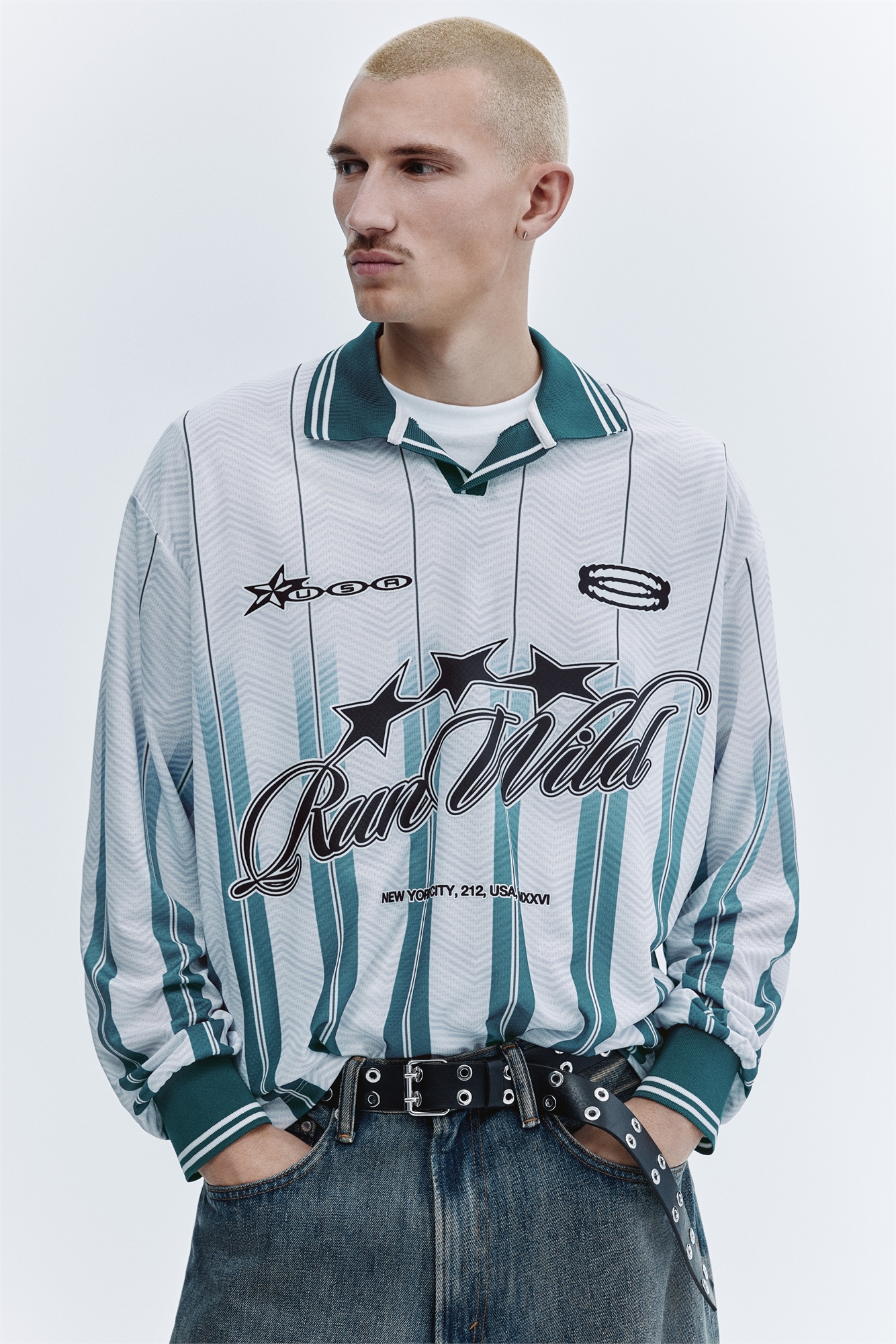 Футбольная рубашка из принтованного сетчатого джерси с отделкой контрастного цвета. Ребристый воротник с V-образной проймой, спущенные плечи, длинные рукава с манжетами в рубчик и прямой подол. Свободный крой для пышного, но не чрезмерно большого силуэта.