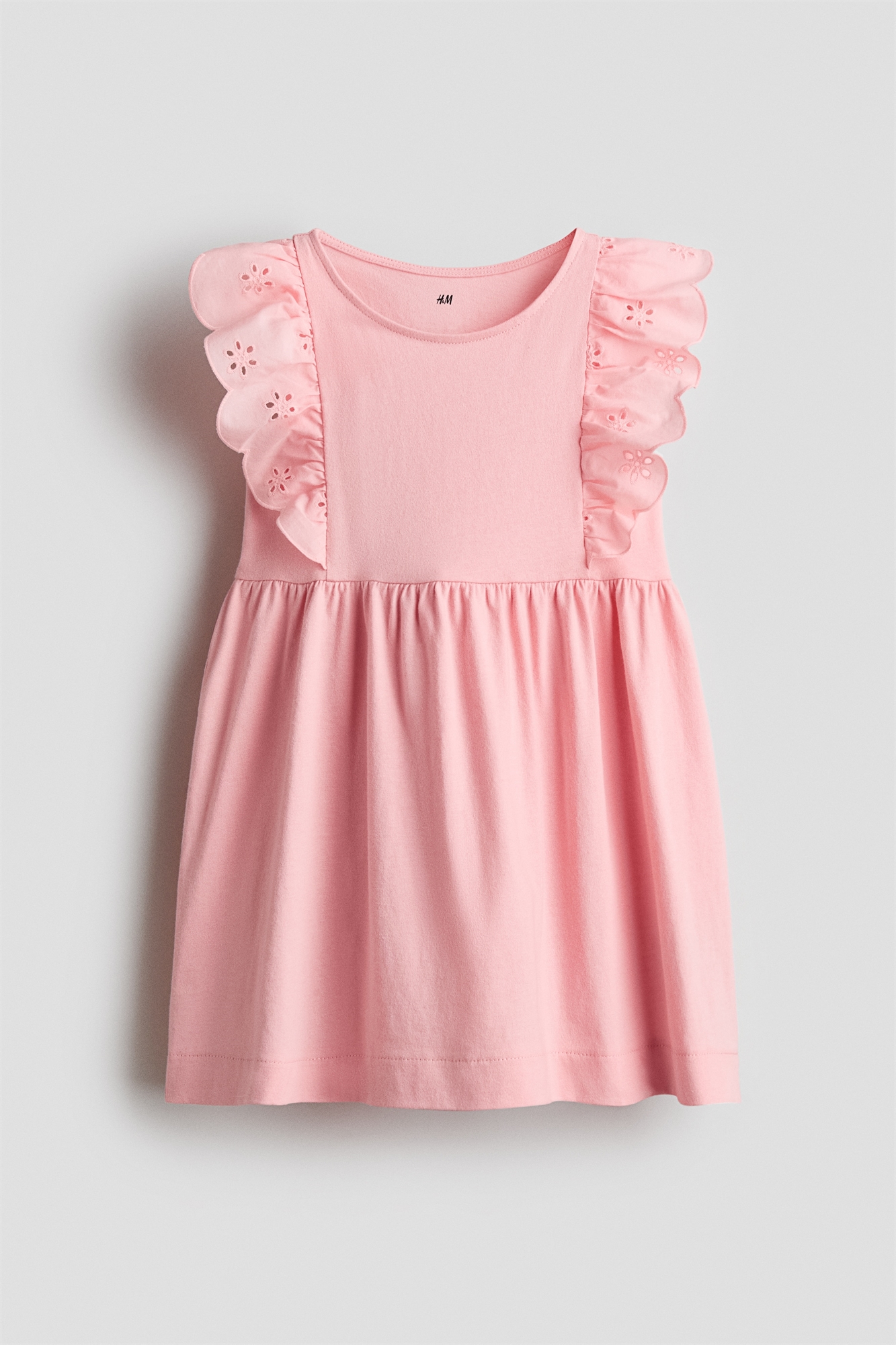Платье без рукавов из мягкого хлопкового джерси с круглым вырезом, волнистым оборкой из английского кружева на плечах и сборкой на талии.