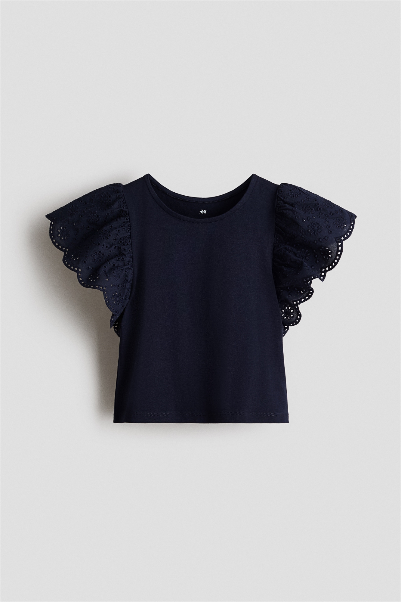 Топ из мягкого хлопкового джерси с круглым вырезом и рукавами-крылышками из хлопчатобумажной ткани с английским кружевом и зубчатыми краями.