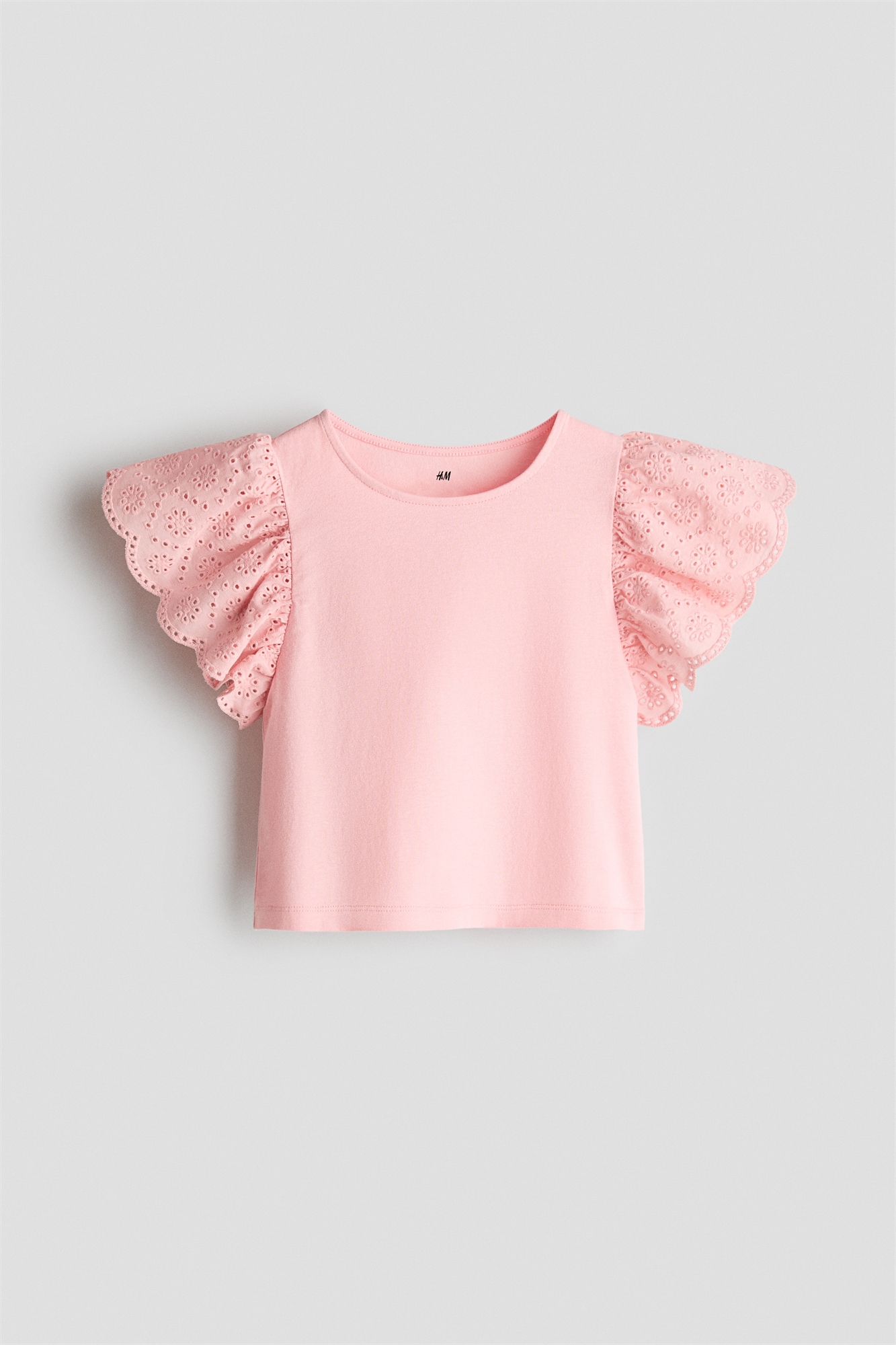Топ из мягкого хлопкового джерси с круглым вырезом и рукавами-крылышками из хлопчатобумажной ткани с английским кружевом и зубчатыми краями.