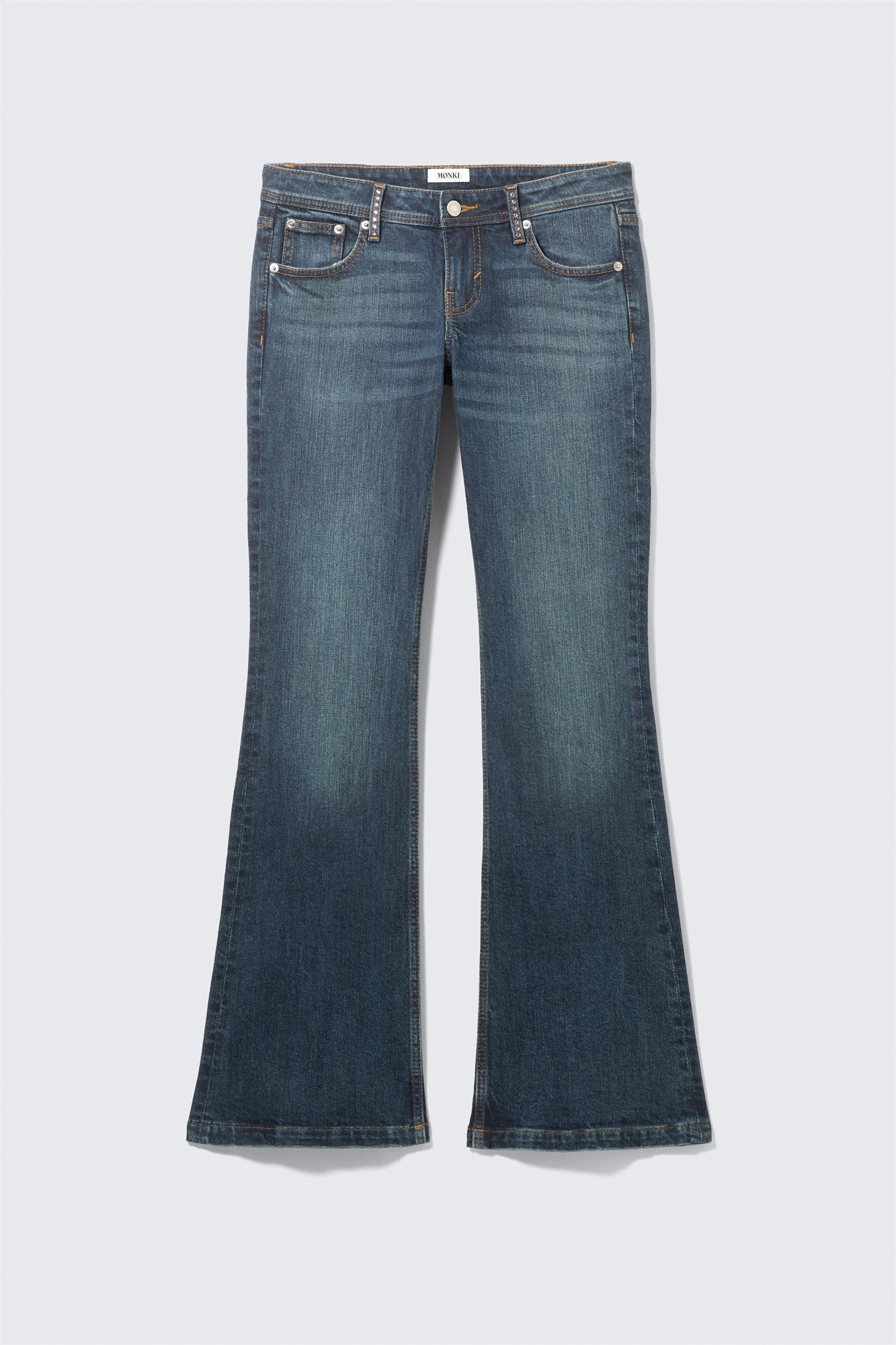 Джинсы с низкой посадкой и расклешенными штанинами, изготовленные из комфортного эластичного денима из органического хлопка с добавлением переработанного хлопка и переработанного полиэстера. Застежка на молнию, задние карманы с вышивкой и украшенные петли для ремня.