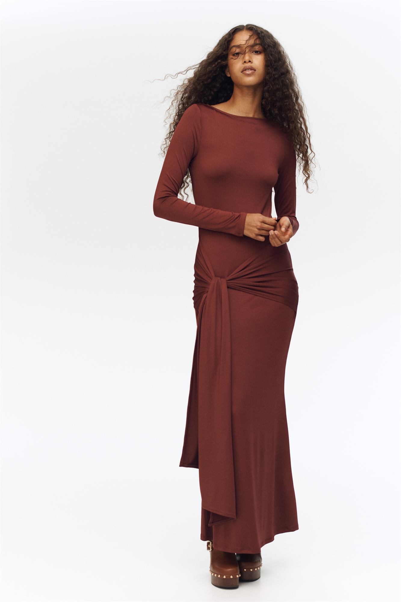 Длинное облегающее платье из эластичного джерси с лодочным вырезом и длинными рукавами. Широкая часть на бедрах, завязывающаяся спереди, создает эффект драпировки.
