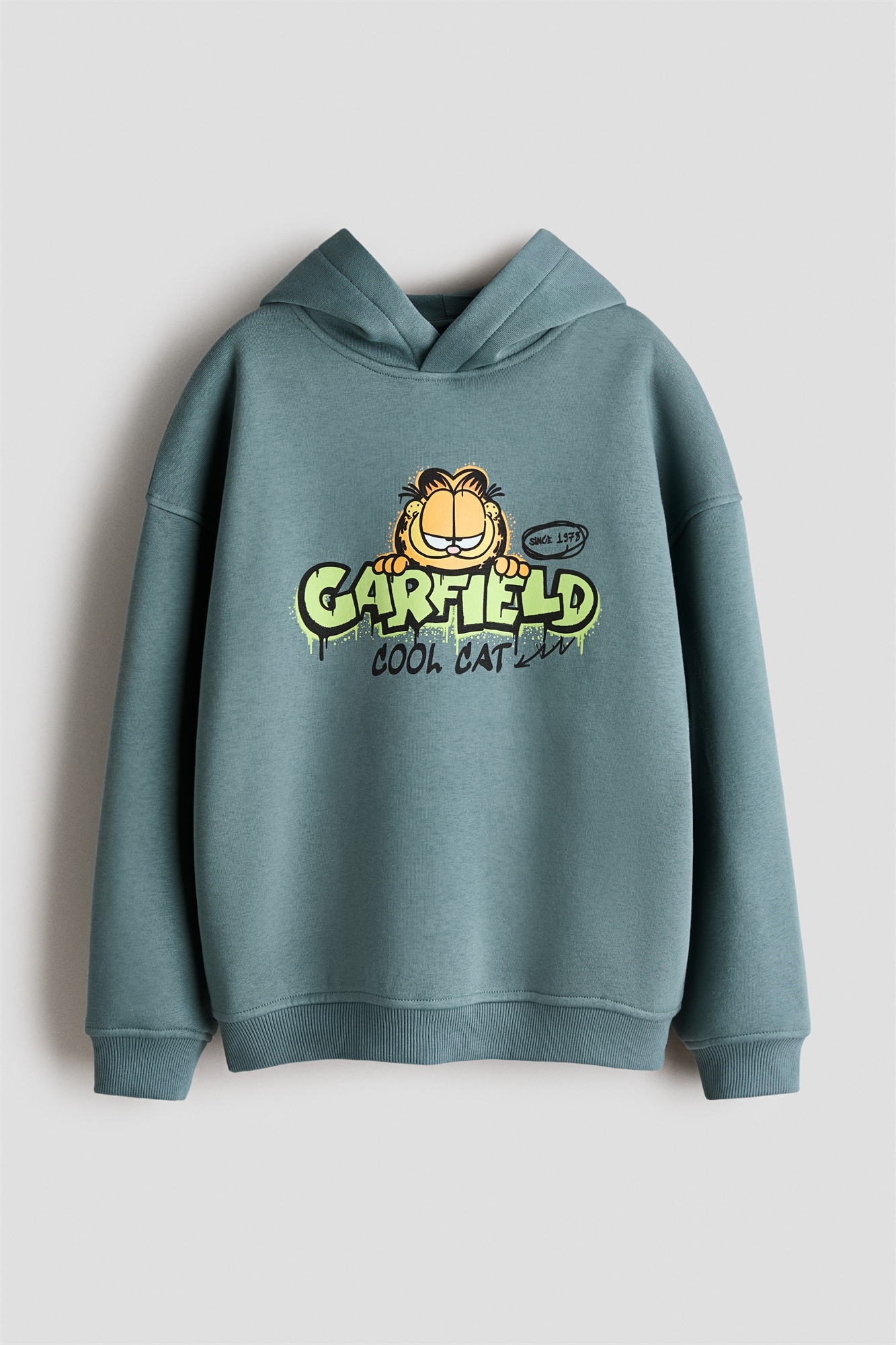 Толстовка свободного кроя из принтованной ткани с мягким начесом внутри. Капюшон на подкладке, накидка спереди, спущенные плечи, длинные рукава, манжеты и подол в рубчик.