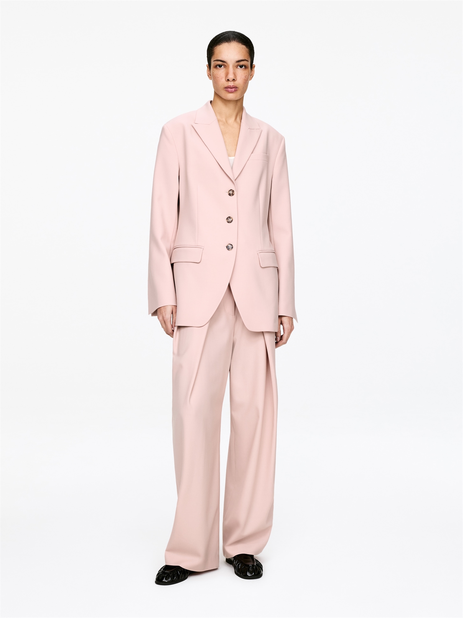 Минималистичный блейзер с слегка удлиненным силуэтом. Модель с застежкой на пуговицах, остроконечными лацканами и карманами с клапанами. Крой regular fit.