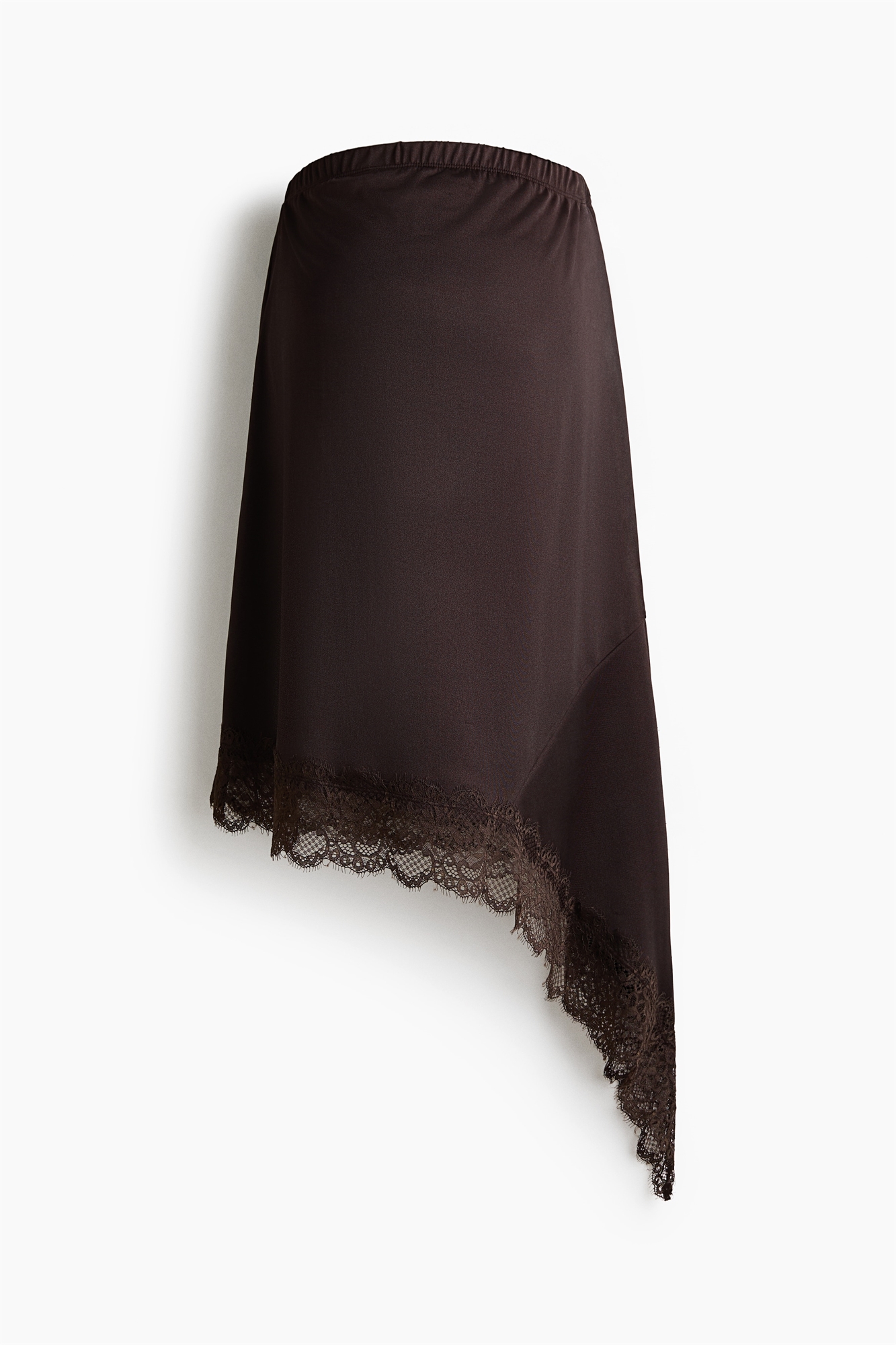 Юбка длиной до колен, свободного кроя, из мягкого джерси, с высокой талией на скрытой резинке и асимметричным подолом с кружевной отделкой.