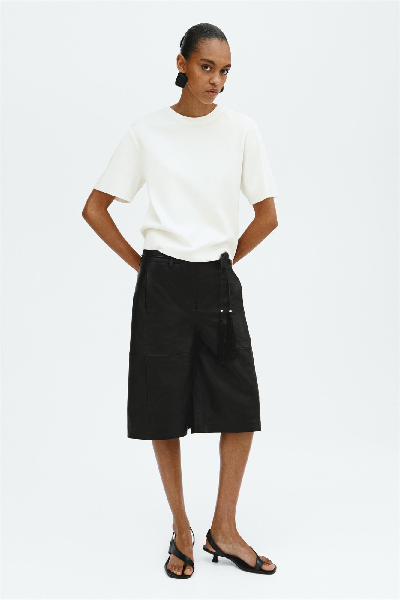 Футболка из плотного трикотажа с ребристым круглым вырезом, заниженными плечами и прямым низом.