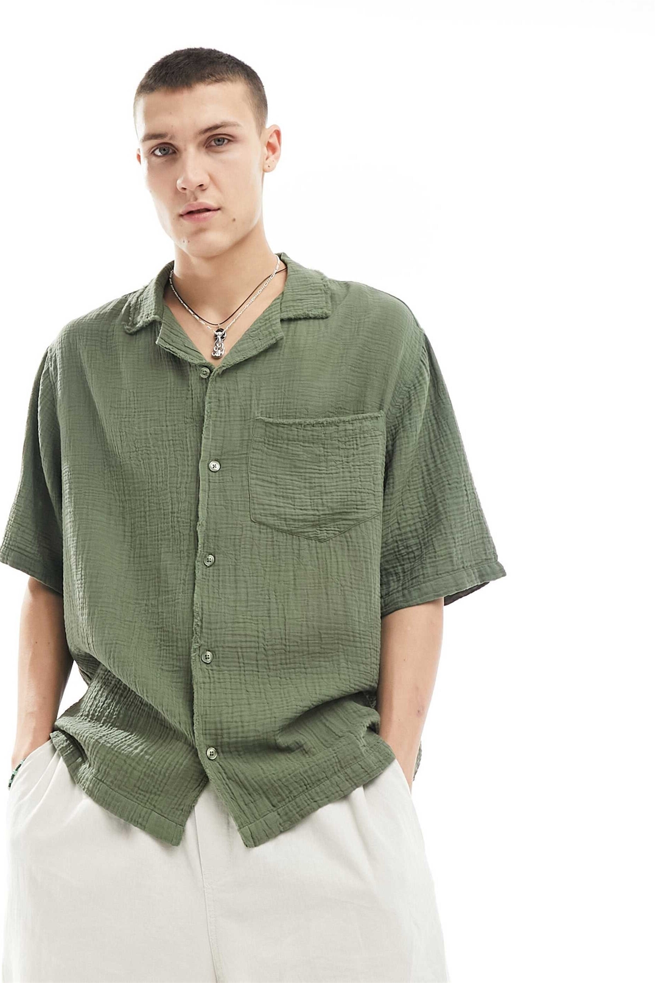 Рубашка свободного кроя с воротником-ревер и текстурированной поверхностью, с короткими рукавами и необработанными швами
