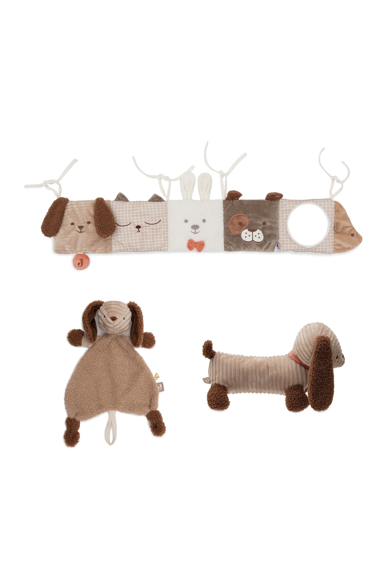 Эти три компаньона обеспечивают разнообразие и уют. Диего, маленькая собачка из коллекции Jollein, - это милая ткань для обнимания, которая крепится к кукле, и особенно мягкая плюшевая игрушка, которая будет сопровождать вашего ребенка повсюду. Обе игрушки выполнены из ребристой ткани цвета бисквита с деталями букле из кожи коричневого цвета. Есть также игрушка для активного отдыха на перекладине манежа: с маленькими зеркальцами, трещащими элементами, колокольчиками и уютной тканью, она обеспечивает веселье и любовь к открытиям. Легко крепится с помощью ремней. В этом наборе есть все, что может стать прекрасным подарком для игры, объятий и восхищения. Размеры:Тканевая книжка с заданиями для манежа: 82x22x3 смТкань для объятий: 29x20x7 смМягкая игрушка: 31x13x18 см