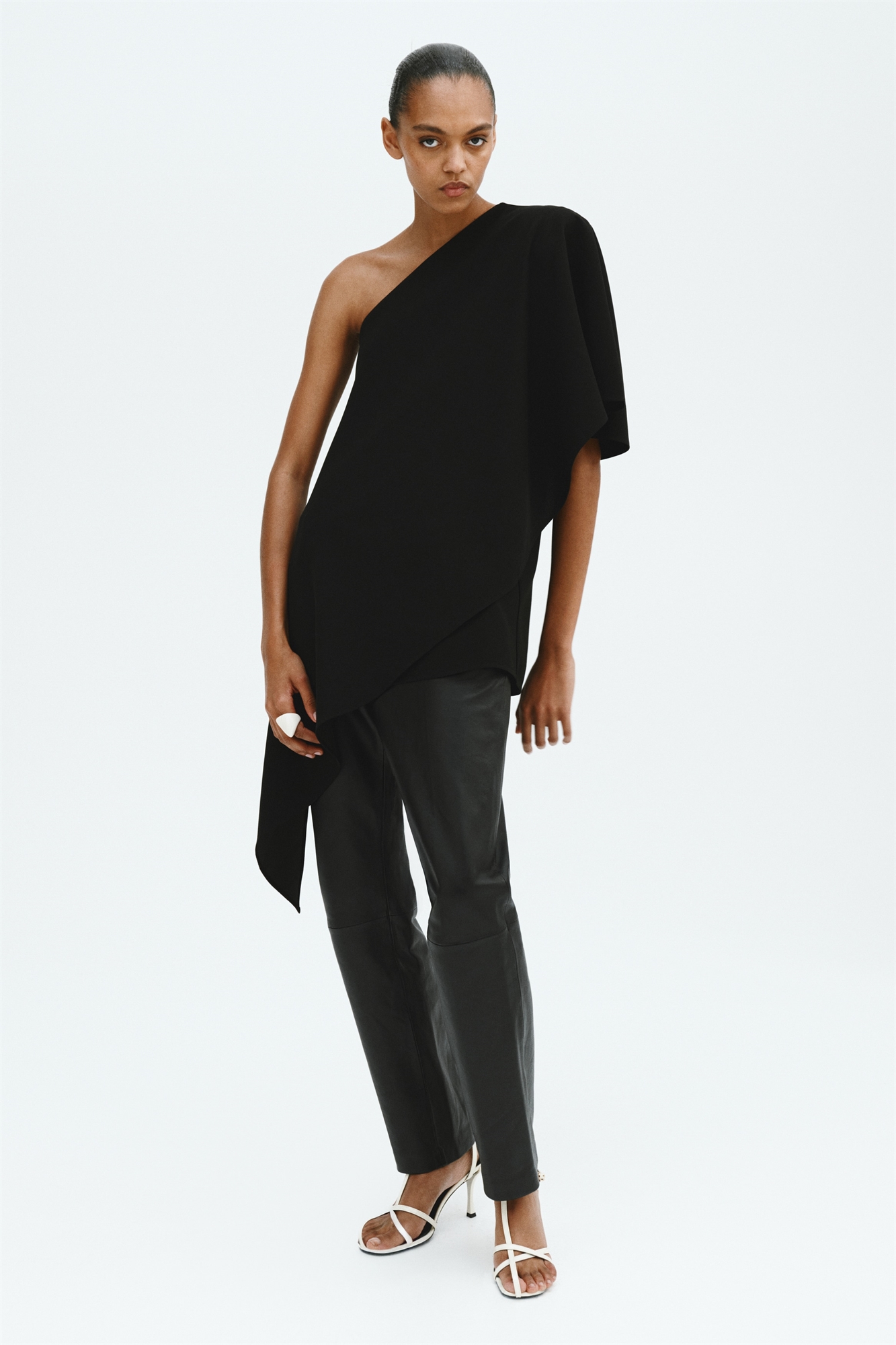Топ на одно плечо из твила с асимметричным вырезом, плечевой накладкой на одной стороне и одним широким рукавом длиной до локтя, который переходит в дополнительный асимметричный слой поперек передней части. Скрытая застежка-молния сбоку.