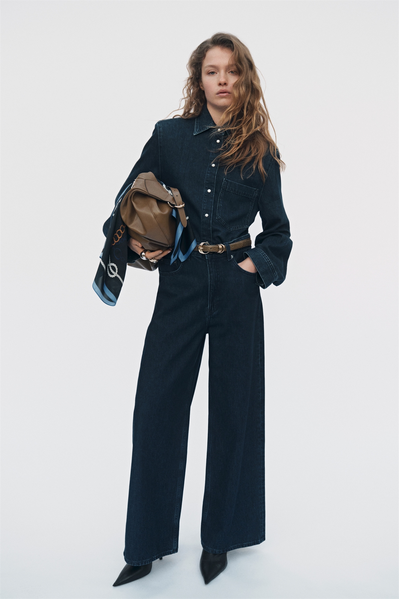Рубашка из хлопкового денима с воротником, перламутровыми пуговицами спереди и открытым нагрудным карманом. Накладки на плечах для придания силуэту четкости, ярмо сзади и длинные рукава с перламутровыми пуговицами на манжетах. Закругленный подол.