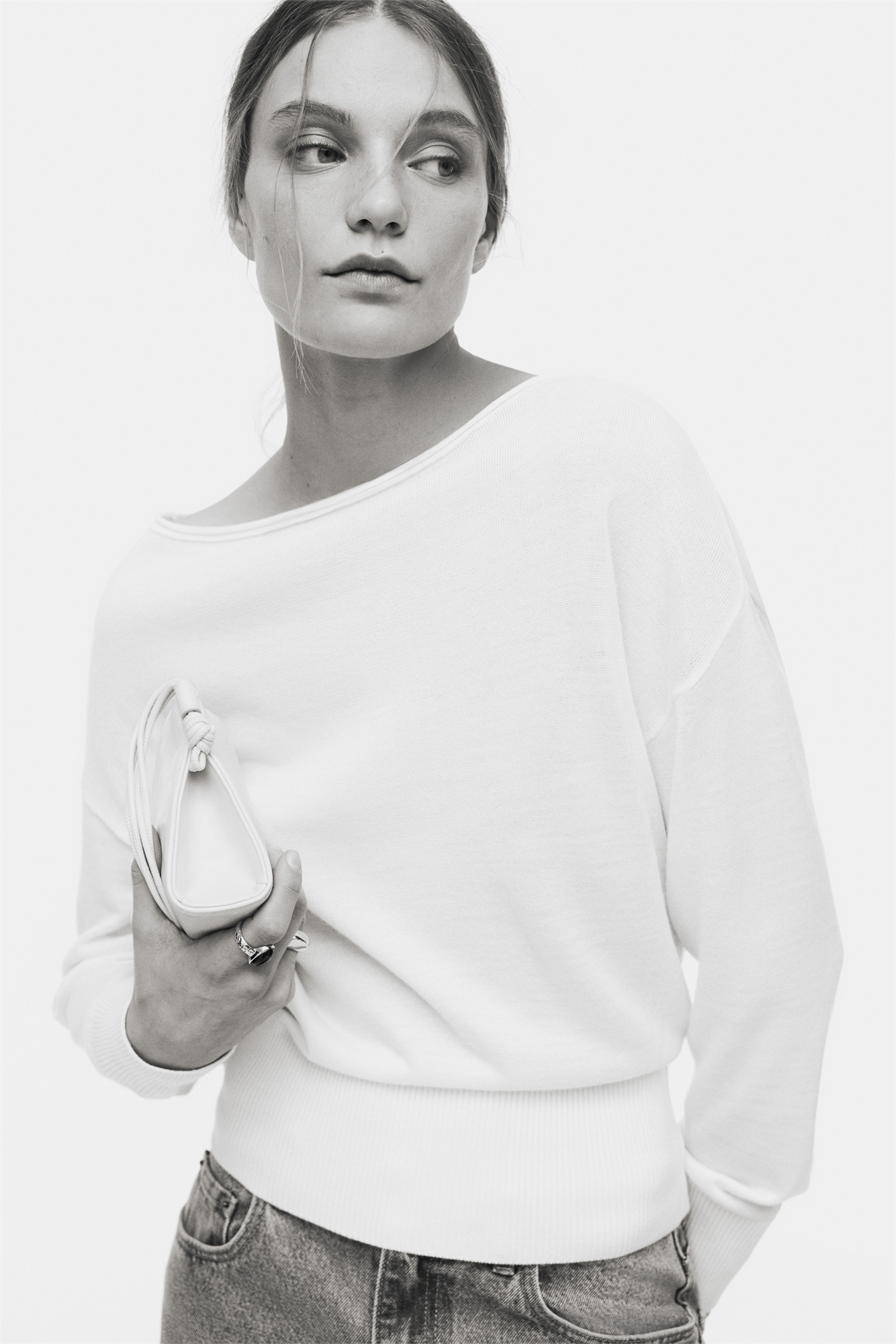 Топ на одно плечо из тонкого трикотажа с широким вырезом-лодочкой, спущенными плечами и длинными рукавами. Манжеты и подол отделаны широкой тесьмой со сборками.
