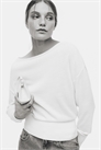 Топ на одно плечо из тонкого трикотажа с широким вырезом-лодочкой, спущенными плечами и длинными рукавами. Манжеты и подол отделаны широкой тесьмой со сборками.