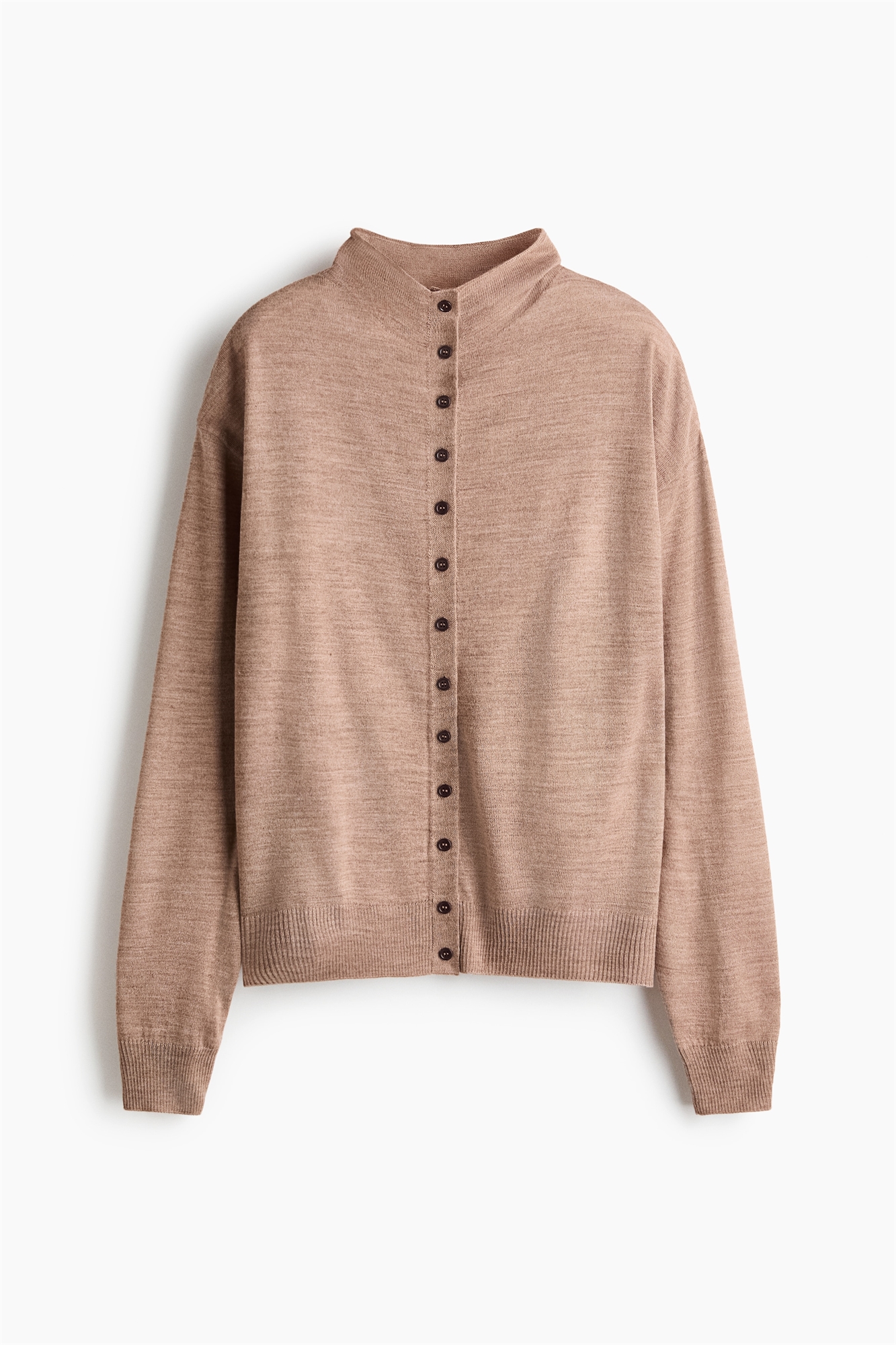 Кардиган из тонкого трикотажа с черепаховой горловиной и пуговицами спереди. Спущенные плечи, длинные рукава и завязки на манжетах и подоле.