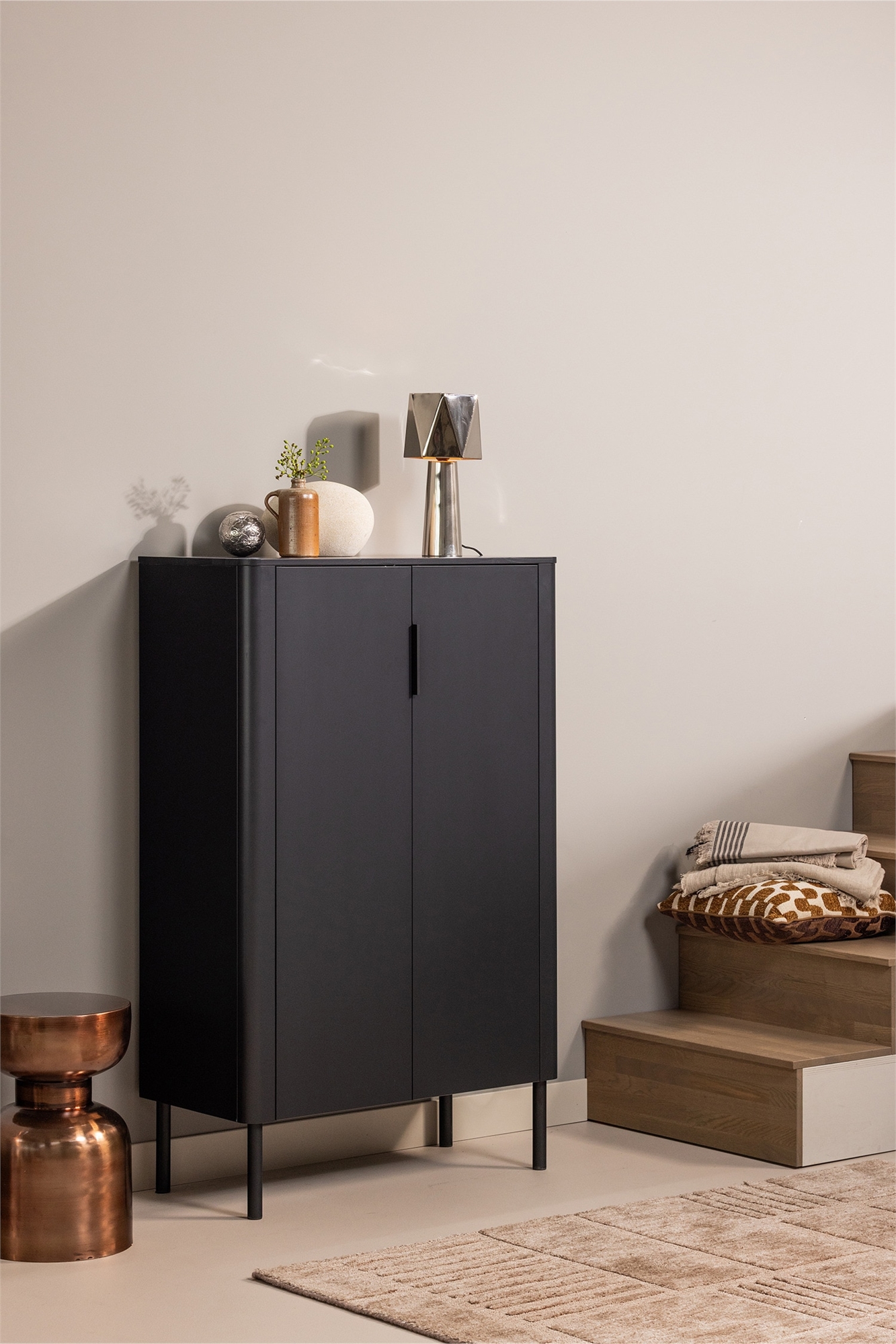 Шкаф Gunnar с двумя дверцами от WOOOD сочетает в себе современный дизайн и функциональность. За двумя дверцами со скромными ручками скрывается просторное отделение с двумя полками, идеально подходящее для хранения посуды или личных вещей. Чистые линии и матовое лаковое покрытие создают спокойный вид, а массив сосны от FSC-сертифицированного поставщика добавляет тепло в комнату. Высота Gunnar составляет 135 см, ширина - 85 см, глубина - 39 см. Ножки высотой 20 см и полки толщиной 1,5 см выдерживают до 15 кг каждая. Мебель весит 27,5 кг и поставляется в двух упаковках с четкими инструкциями по сборке.