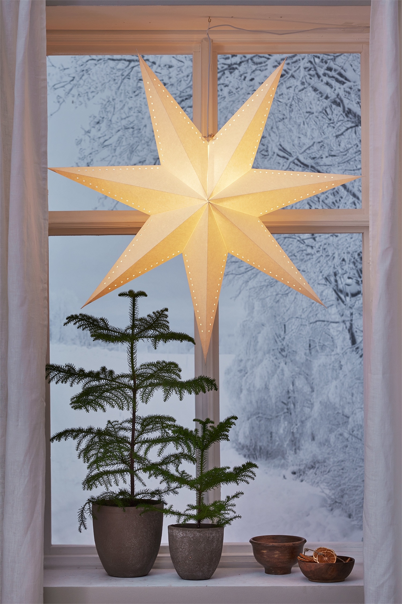 Бумажная звезда со стильным узором из отверстий. Красивое рождественское украшение. Повесьте одну или несколько звезд вместе на окно или на стену. Соедините их шнуром, чтобы зажечь. Глубина 15 см. Диаметр 60 см.