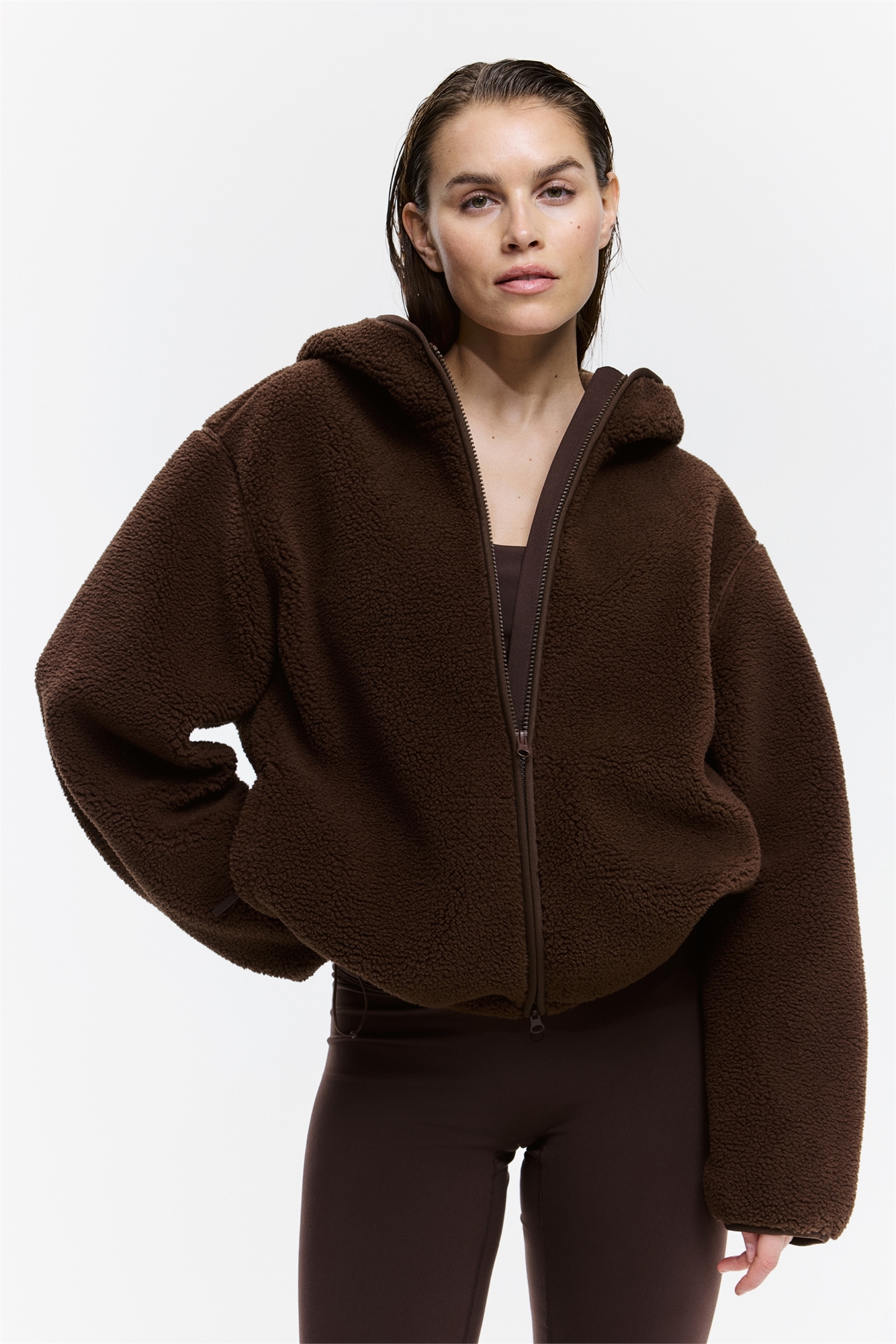 Спортивная куртка с капюшоном из мягкого, теплого плюша. Свободный крой с воротником-стойкой, двусторонней застежкой-молнией спереди и боковыми карманами на молнии. Длинные рукава с узкой резинкой на манжетах и скрытой эластичной кулиской с фиксаторами на шнурке по низу. Без подкладки.