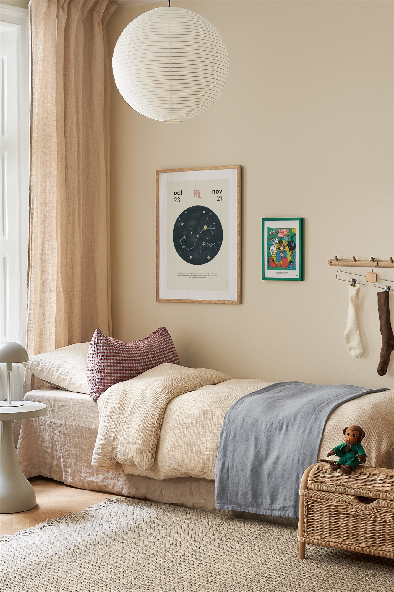 Созвездие Рыб нарисовано белым и желтым карандашами в детском мультяшном стиле на фактурном фоне. На плакате, выполненном художницей Юлией Ткачевой, также изображены зодиакальные даты и символ в верхней части. Внизу написаны черты зодиака для придания игривости и индивидуальности. Встроенная белая рамка элегантно обрамляет мотив.