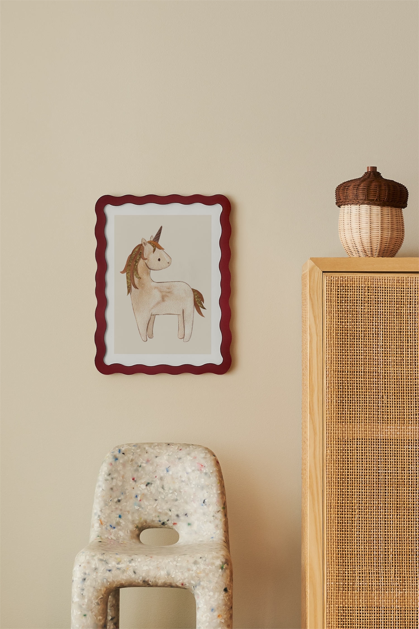 Акварельная иллюстрация единорога с блестящими деталями в гриве и хвосте. Мягкие тона и мерцающие акценты придают ей волшебное очарование. Встроенная белая рамка элегантно обрамляет мотив.