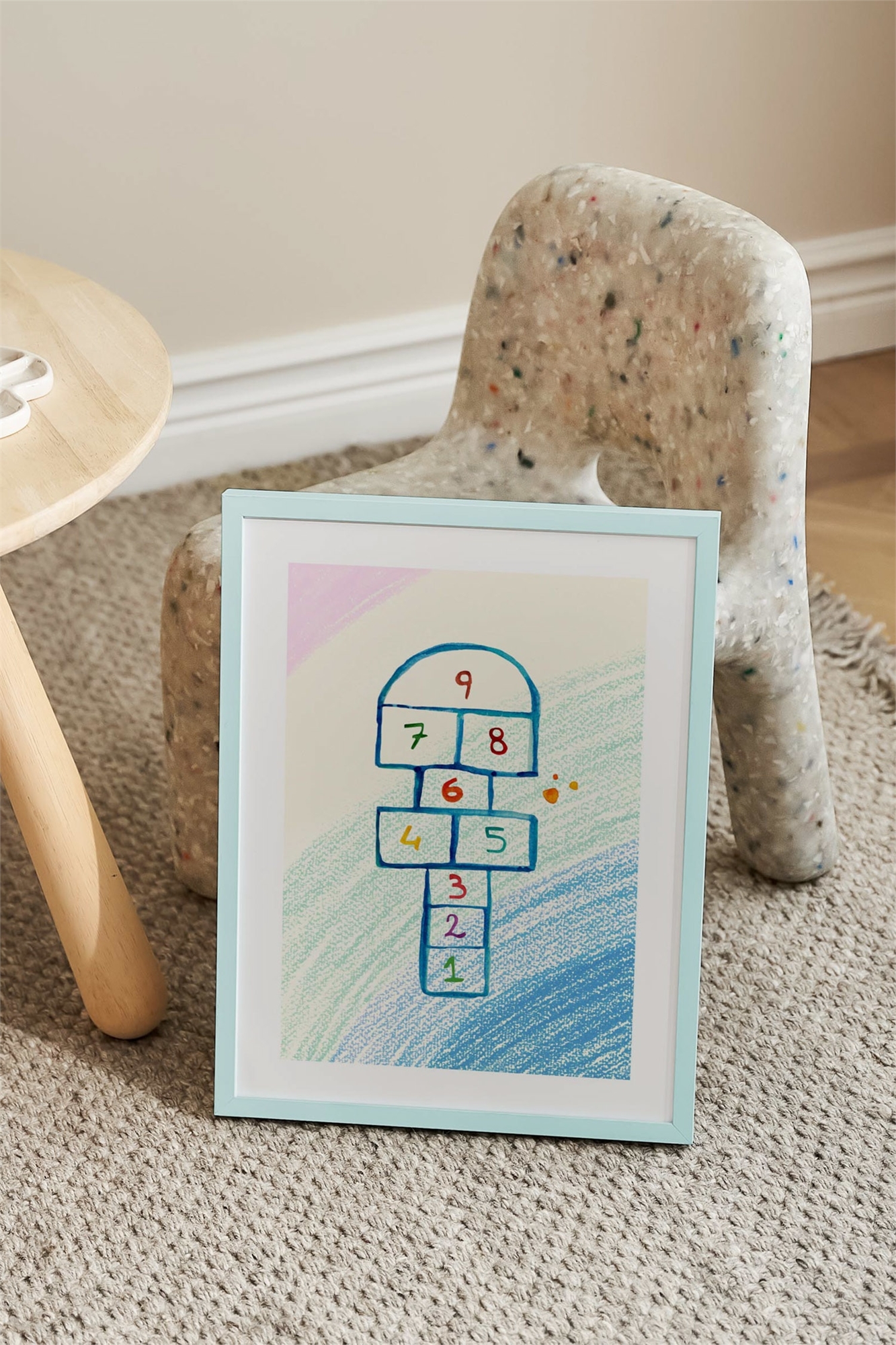 Постер "Хопскотч", нарисованный в стиле мелка, вызывает чувство игры и воображения. Нежные тона голубого, зеленого и розового придают ему жизнерадостный вид. Встроенная белая рамка элегантно обрамляет мотив.