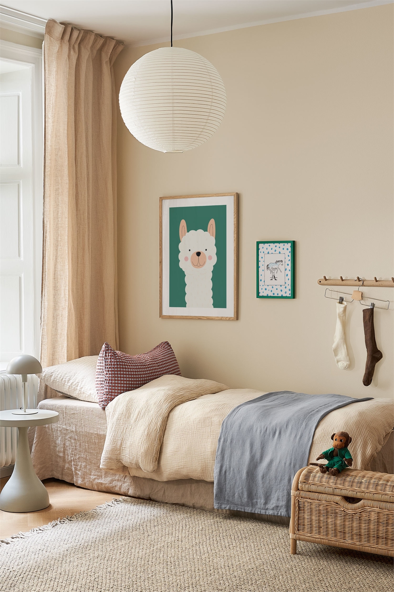 Эта нарисованная вручную иллюстрация альпаки добавит веселый штрих в любую детскую комнату. Его нежные черты и теплый коричневый фон создают мягкое и привлекательное ощущение. Встроенная белая рамка элегантно обрамляет мотив.